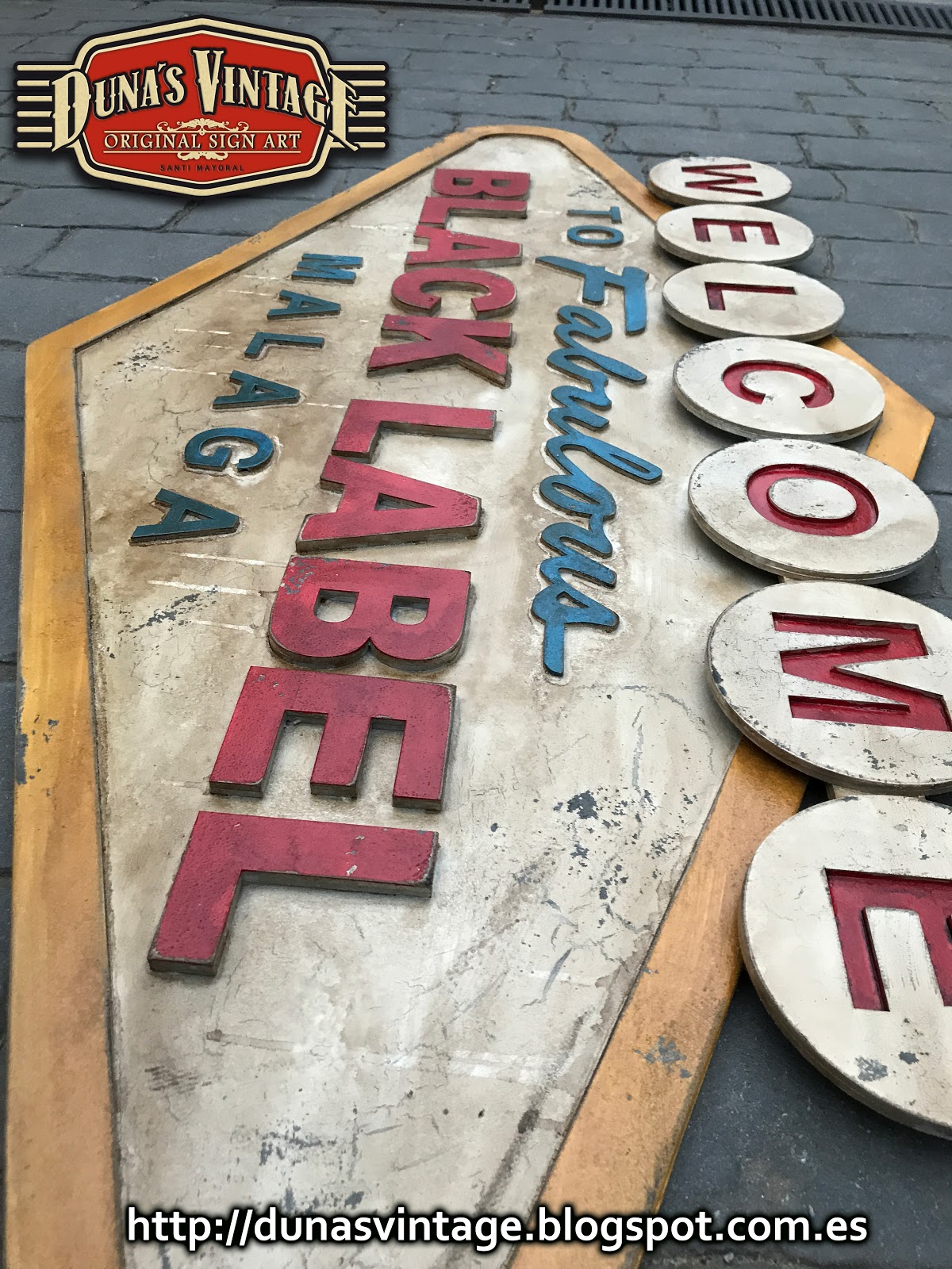 Cartel de madera para Black Label de Málaga tamaño 1400x800mm, este cartel es como el mítico cartel de Welcome LAS VEGAS pero con la marca de su local en Málaga, el cartel esta trabajado con letras corpóreas y partes en relieve para darle mas autenticidad. Duna´s Vintage