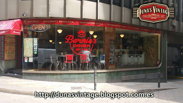 Cartel para el restaurante Bernie´s diner de Barcelona, Comida muy auténtica y de calidad www.berniesdiner.com, el tamaño del cartel es de 8300x250mm con letras en relieve y acabado Vintage.