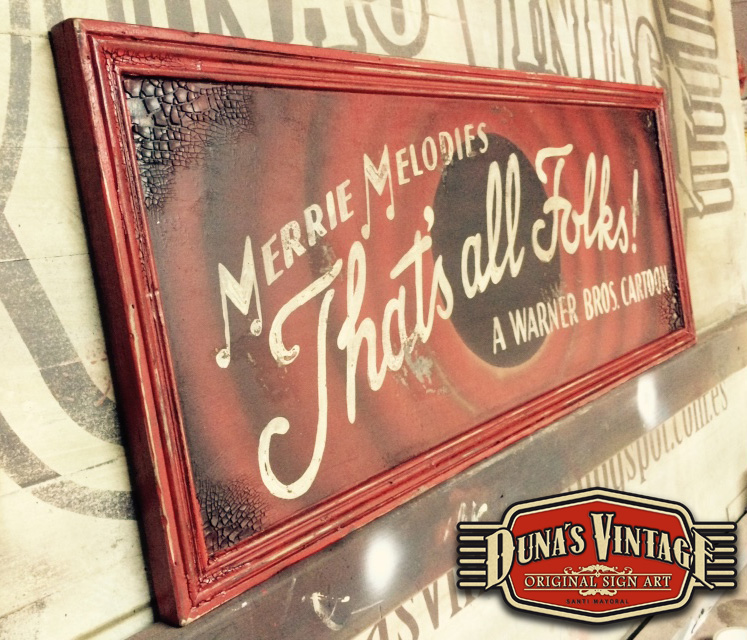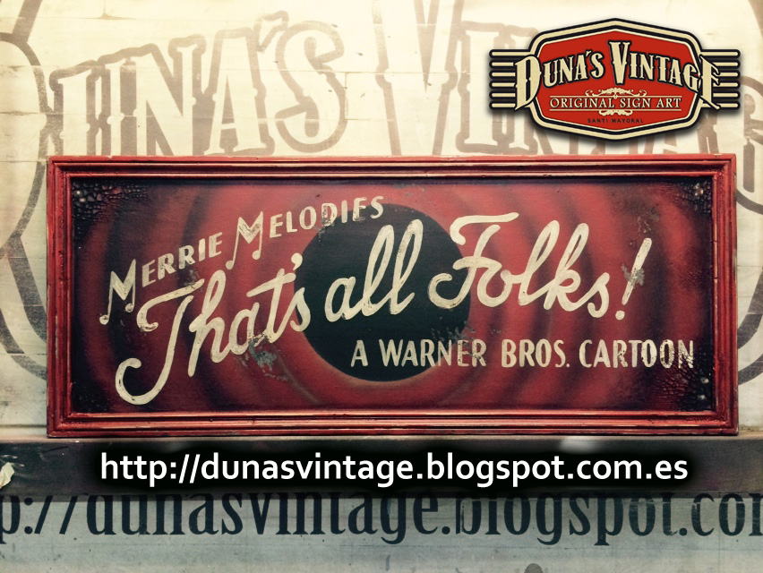 Cartel «That´s all Folks! Duna´s Vintage».Tamaño 850x350mm. Este cartel esta tratado con el efecto Retro que Duna´s Vintage emplea en sus carteles pintados a mano. (Hay algunos carteles que se han vendido pero se pueden hacer otros iguales o personalizados con el texto que se quiera). Lo puedes encontrar tambien en Vintage 50.