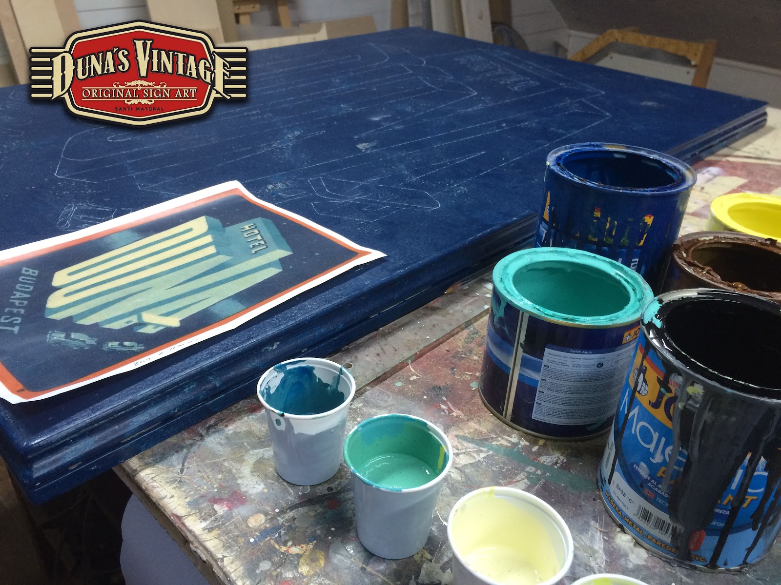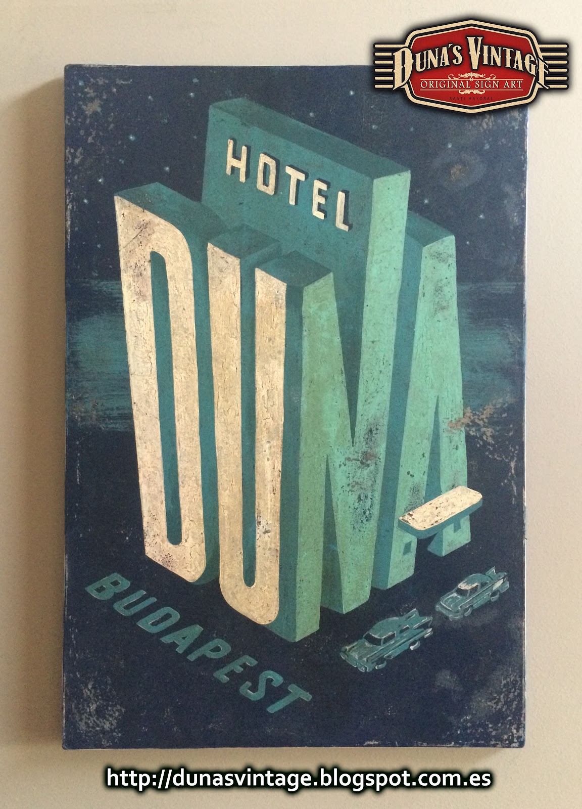 Replica cartel retro del HOTEL DUNA de BUDAPEST, tamaño 1200x850mm este cartel esta trabajado en madera, pintado a mano y con el efecto Retro Vintage que Duna´s Vintage emplea en sus trabajos.
