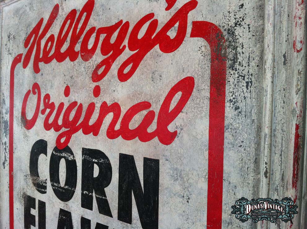 Cartel de Kellogg´s Original Corn Flakes tamaño 1220x800mm. Este cartel es del año 1940, Duna´s Vintage ha trabajado mucho el efecto envejecido, para lograr la imagen del auténtico cartel creado hace más de 70 años. Duna´s Vintage. Precio 450€.