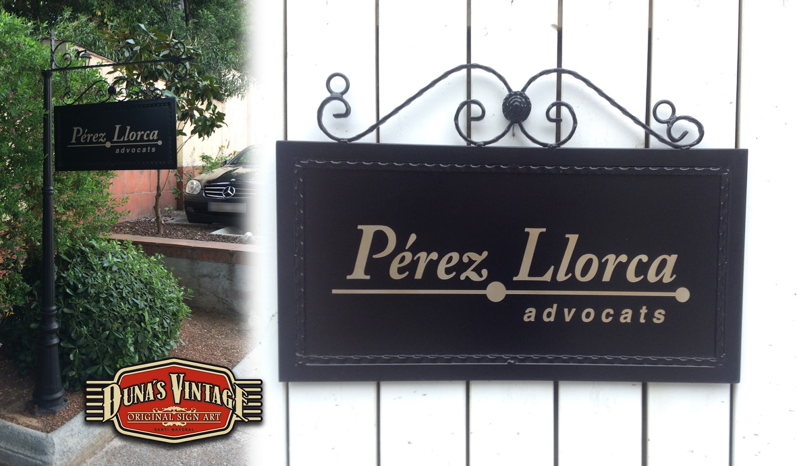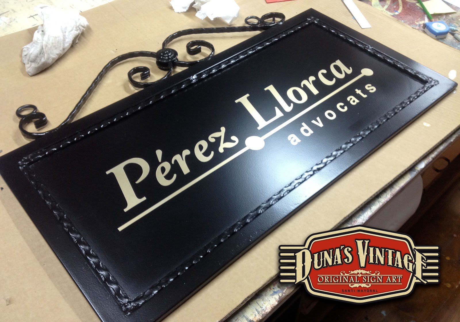 Cartel tipo banderola de hierro pintado a dos caras tamaño 1000x700mm, este cartel se a pintado con pintura satinada negra y las letras en oro, es un  cartel sencillo pero elegante para un bufete de abogados de Barcelona. Duna´s Vintage.