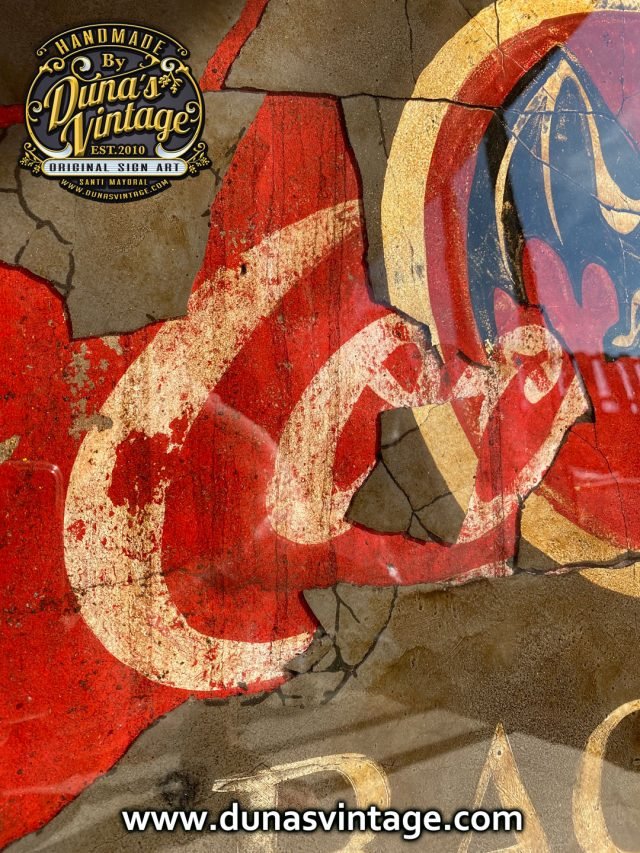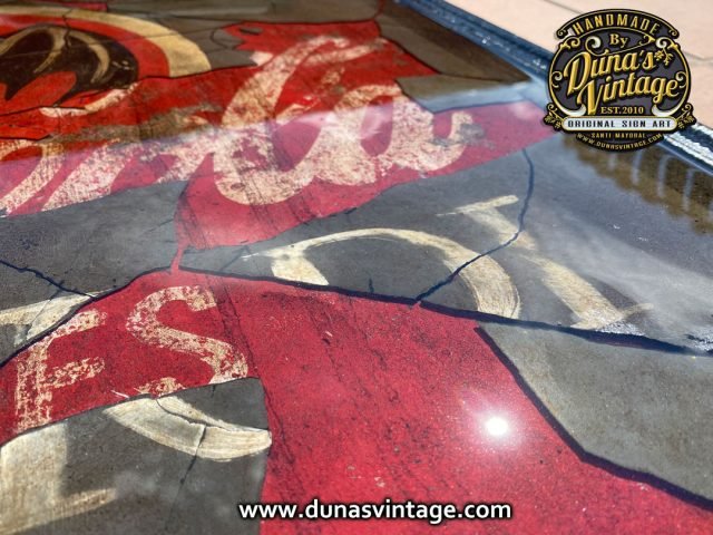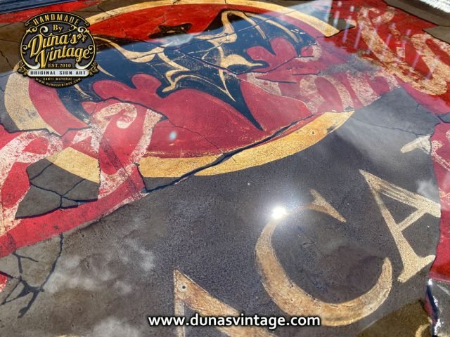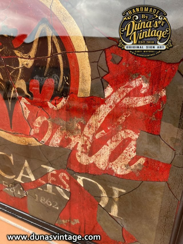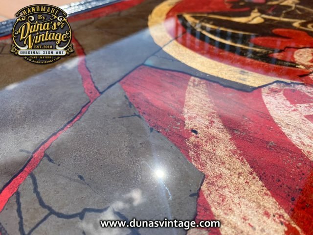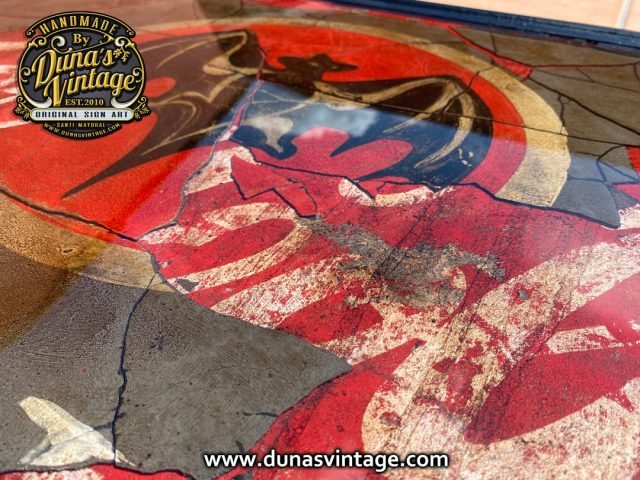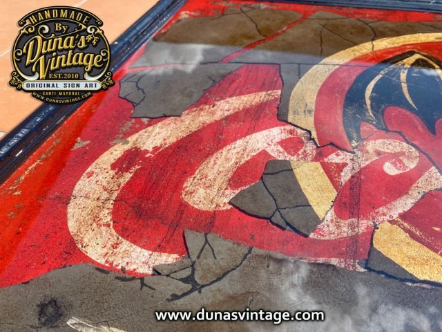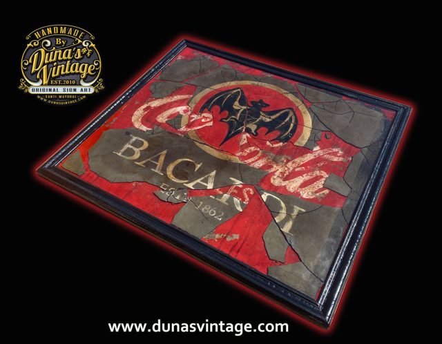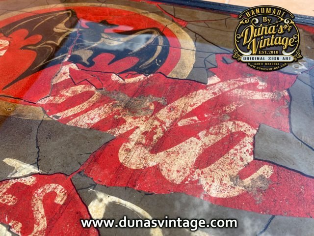 Este cartel tiene su complicidad y unas cuantas horas por no decir muchas para legar a conseguir este efecto, partimos de un cartel en madera tamaño 720x620mm con una publicidad de Coca-Cola pintada a mano y con su toque Vintage, posteriormente se ha dado una capa de unos 2mm de pasta niveladora color negro. Cuando estaba bien seco se ha pintado el logo de Bacardi y hemos ido destapando la imagen que teníamos debajo de Coca-Cola para conseguir este efecto de dos marcas dejando respirar la de abajo y manteniendo la de arriba para conseguir este efecto, posteriormente se le ha tirado epoxi para conseguir este efecto de profundidad, en las fotos podréis ver los detalles.