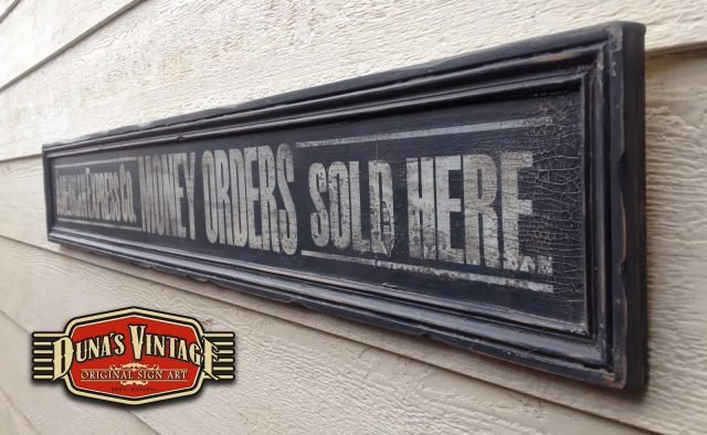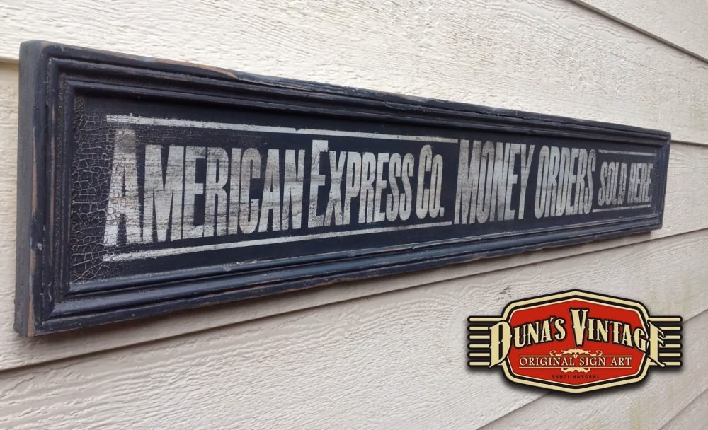 Cartel «AMERICAN EXPRESS Co» Replica cartel de los años 20´Tamaño 1200x190mm. Este cartel esta tratado con el efecto Retro que Duna´s Vintage emplea en sus carteles pintados a mano. (Hay algunos carteles que se han vendido pero se pueden hacer otros iguales o personalizados con el texto que se quiera). Duna´s Vintage