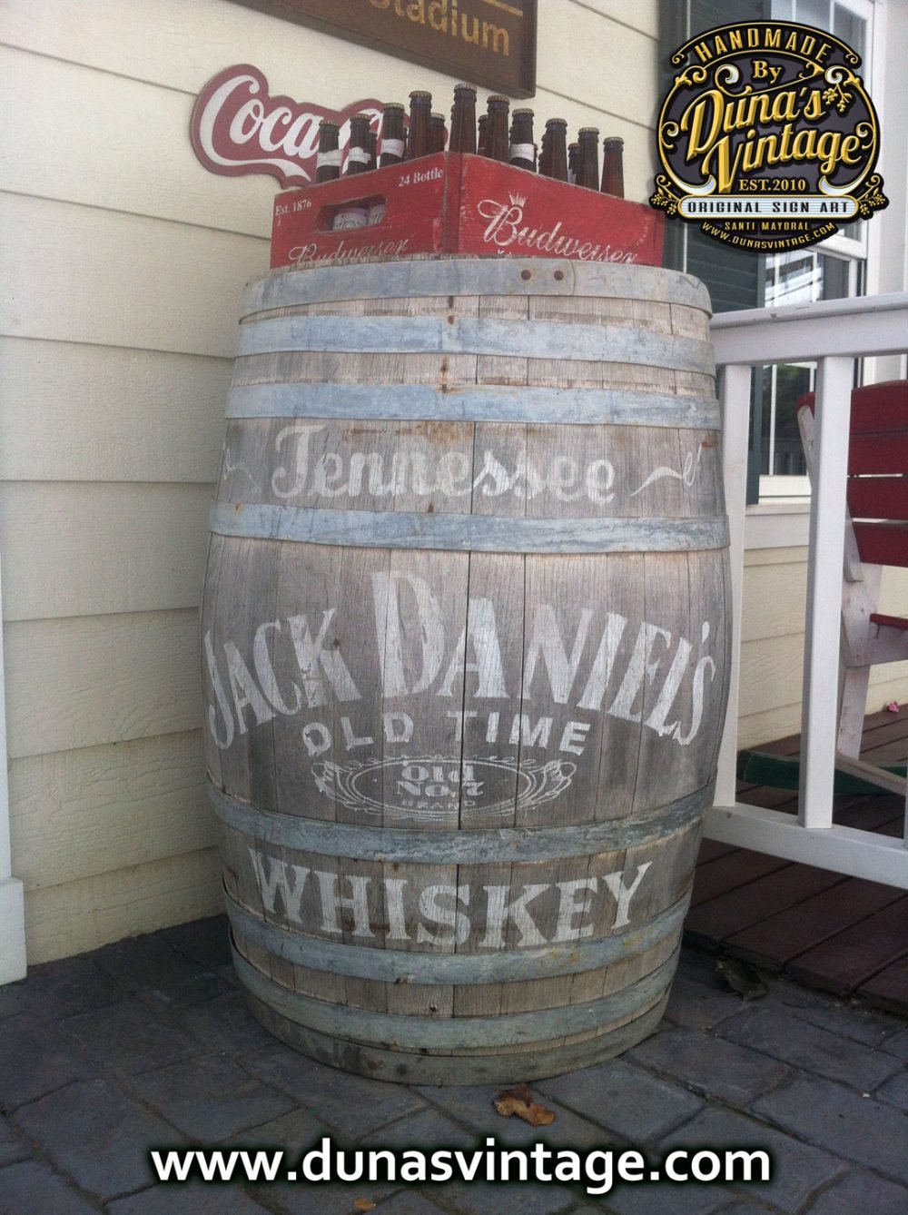 Barrica de Madera personalizada de Jack Daniel´s y caja de cervezas Budweiser personalizada con efecto Vintage.