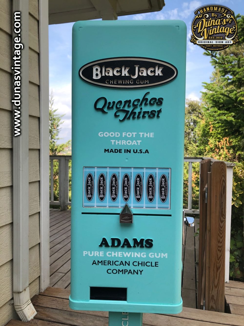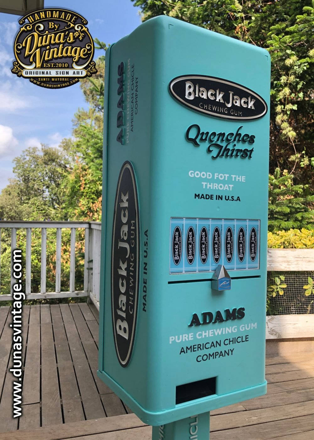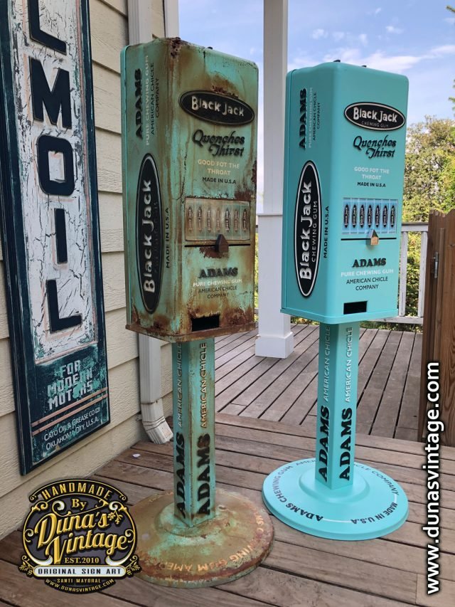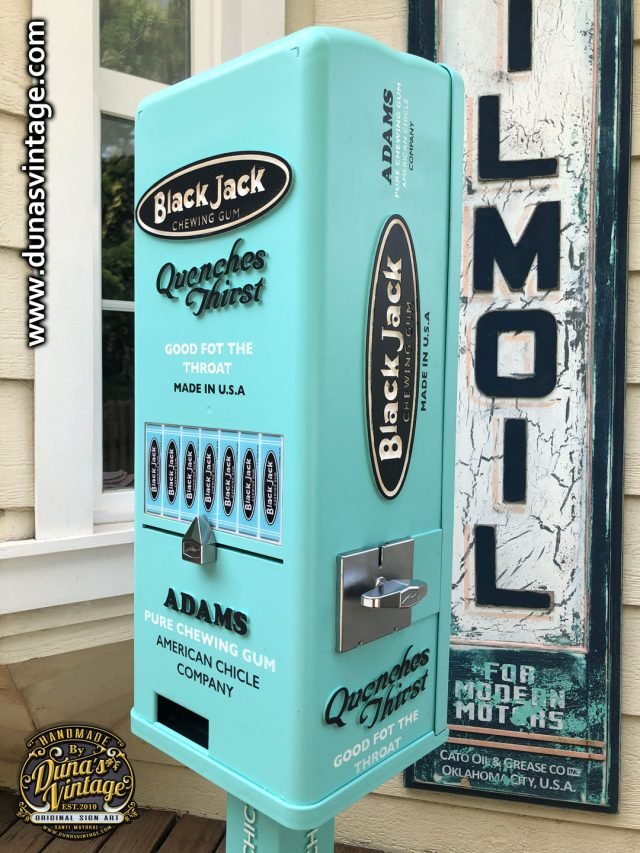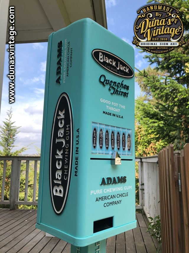 Aquí os deja la última maquina personalizada esta vez de la marca Black Jack Gum de Adams esta marca de Chicles se creó en 1869 con sabor a regaliz, se ha trabajado con los colores y logotipos de la marca de la época para darle un toque retro, esta misma maquina la tenéis también con el toque que Duna´s Vintage les da a sus trabajos, efecto desgastado y oxidado que la podréis ver en otro post. Esta máquina es la base de una de Orbit funciona con 1€ y el precio de la maquina es de 500€.