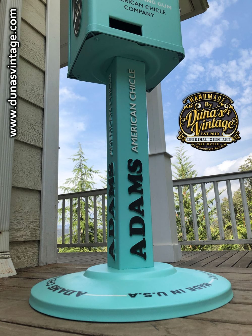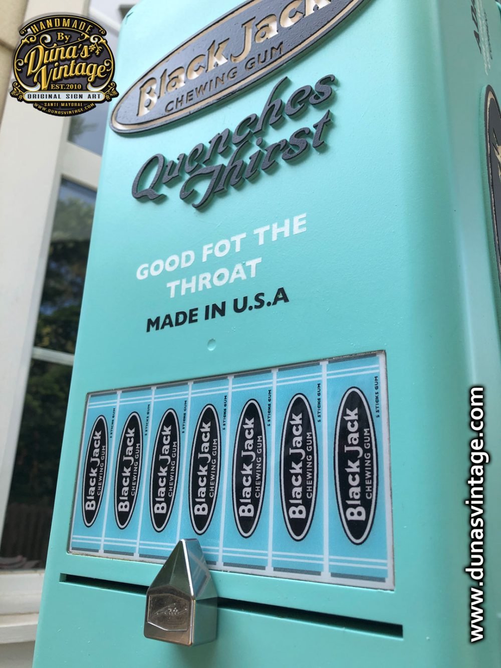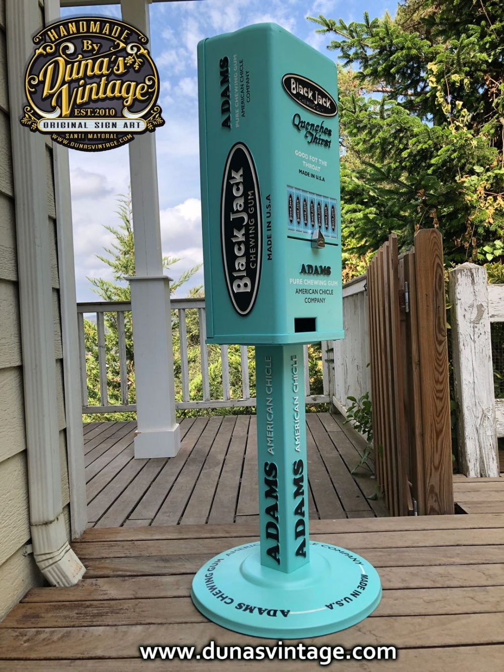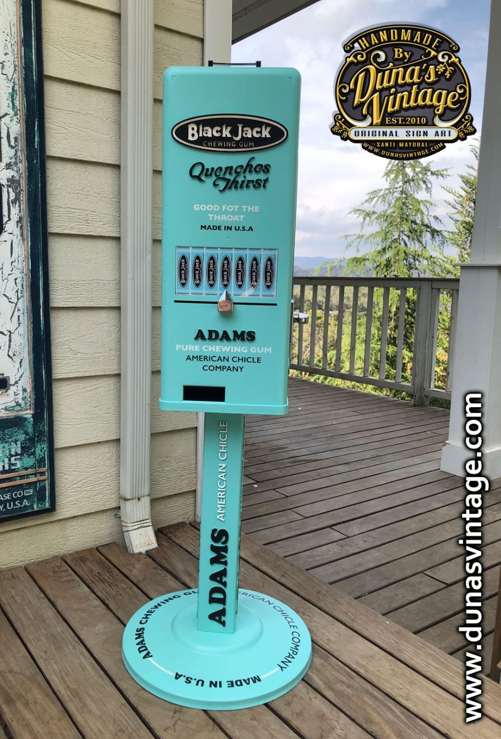 Aquí os deja la última maquina personalizada esta vez de la marca Black Jack Gum de Adams esta marca de Chicles se creó en 1869 con sabor a regaliz, se ha trabajado con los colores y logotipos de la marca de la época para darle un toque retro, esta misma maquina la tenéis también con el toque que Duna´s Vintage les da a sus trabajos, efecto desgastado y oxidado que la podréis ver en otro post. Esta máquina es la base de una de Orbit funciona con 1€ y el precio de la maquina es de 500€.