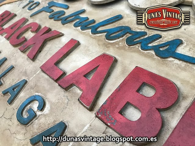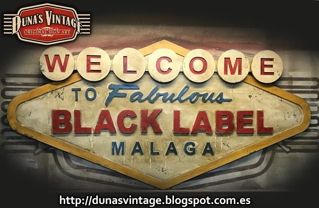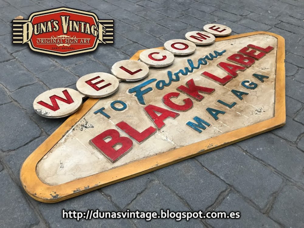Cartel de madera para Black Label de Málaga tamaño 1400x800mm, este cartel es como el mítico cartel de Welcome LAS VEGAS pero con la marca de su local en Málaga, el cartel esta trabajado con letras corpóreas y partes en relieve para darle mas autenticidad. Duna´s Vintage
