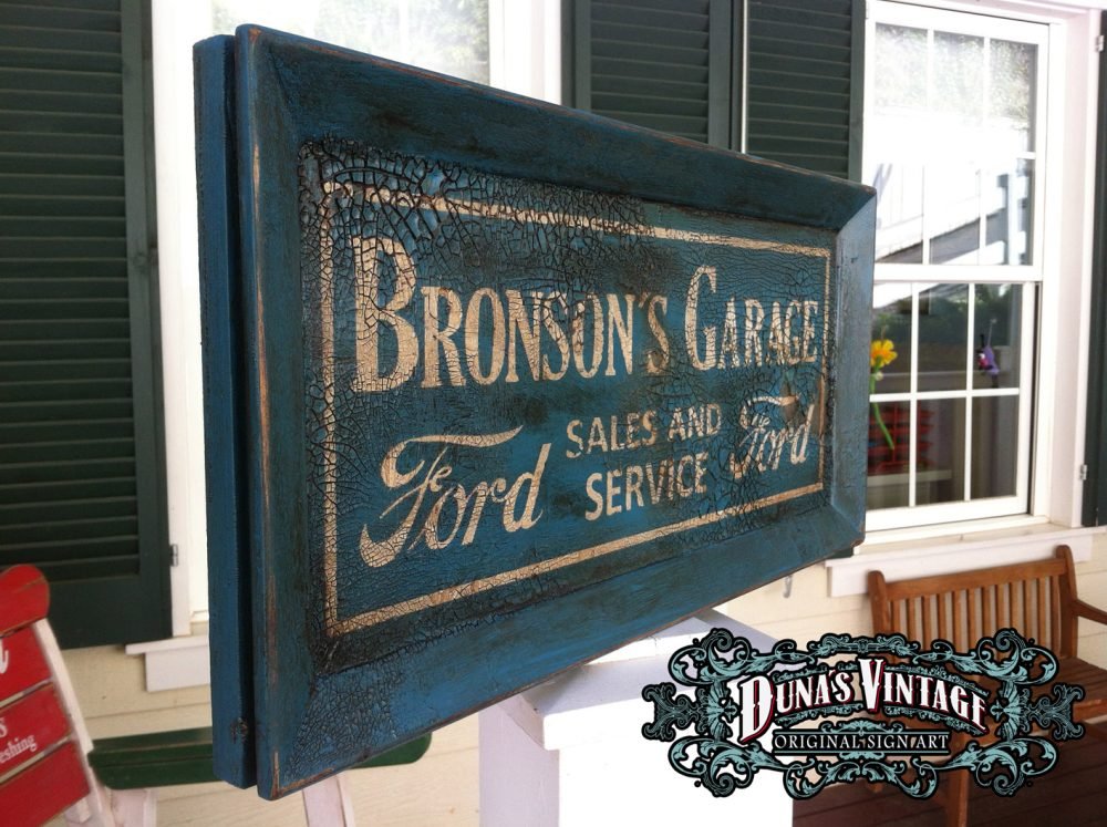 Cartel «BRONSON´S GARAGE FORD» tamaño 580x280mm. Este cartel esta tratado con el efecto Retro que Duna´s Vintage emplea en sus carteles pintados a mano.(Hay algunos carteles que se han vendido pero se pueden hacer otros iguales o personalizados con el texto que se quiera).