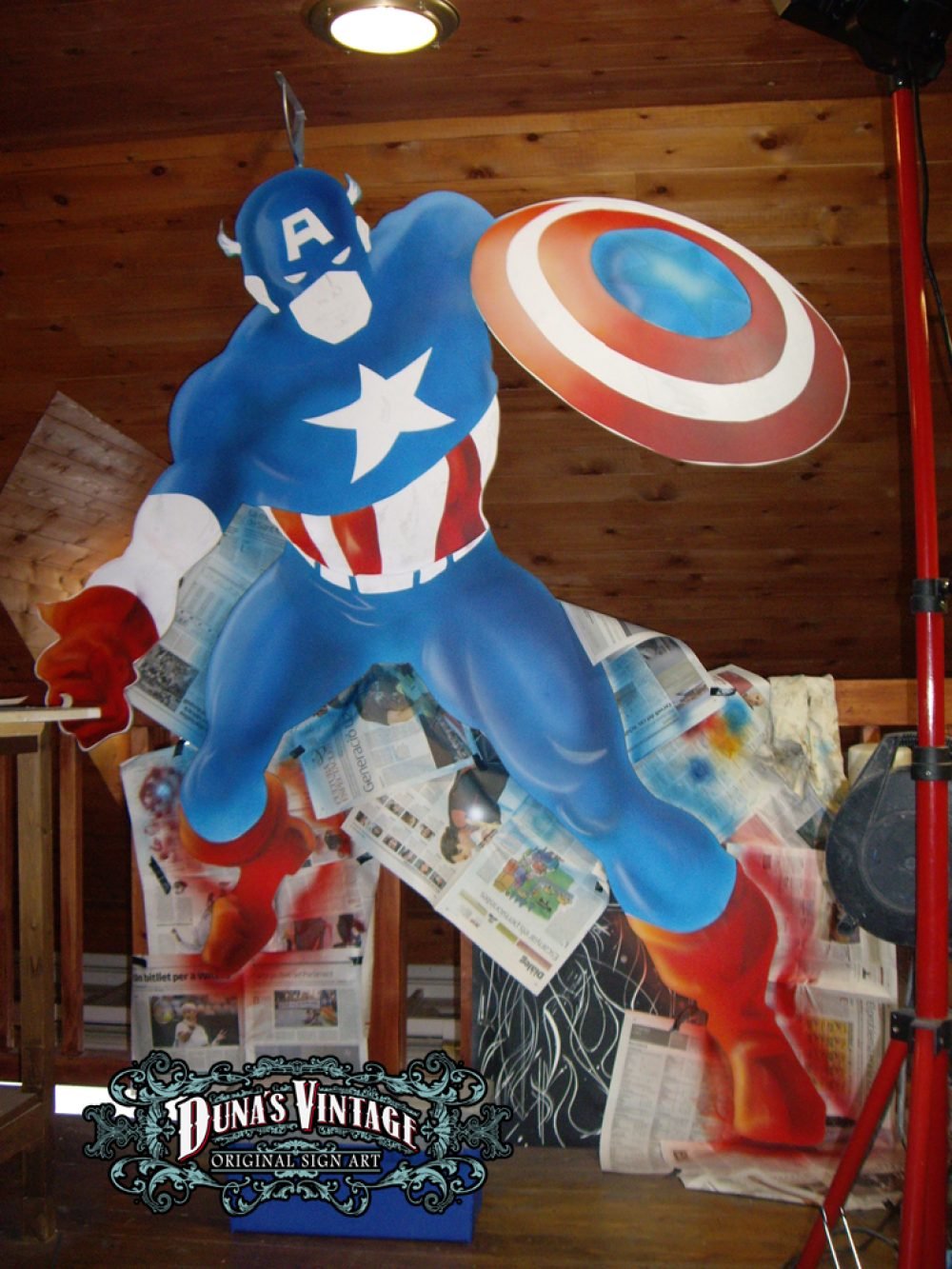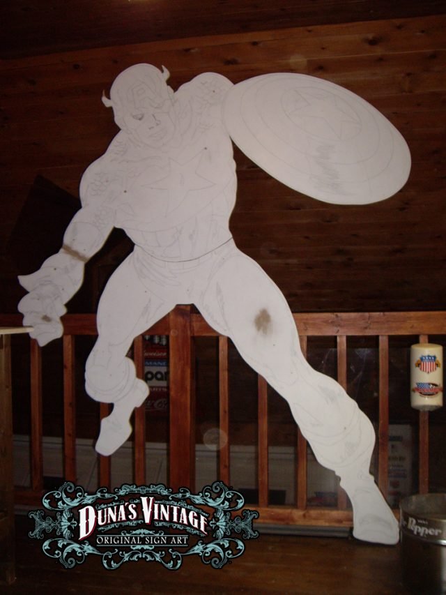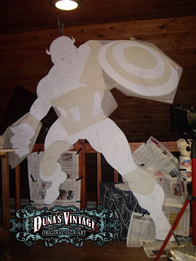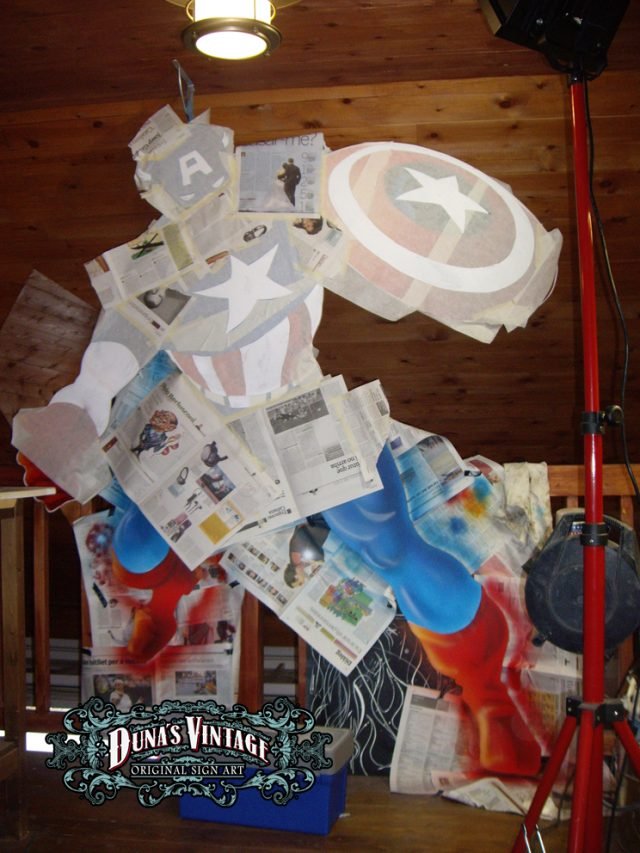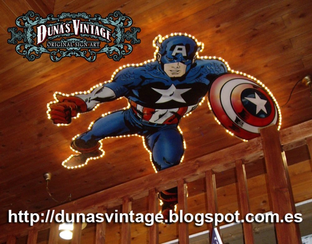 Esta figura del Capitan America trabajada en madera de DM a tamaño 2500x1900mm pintado con aerografo y perfilado a pincel, con iluminación en todo el contorno de la figura. Duna´s Vintage.