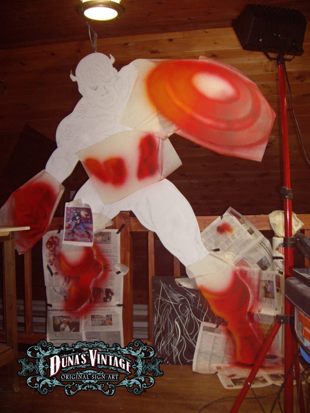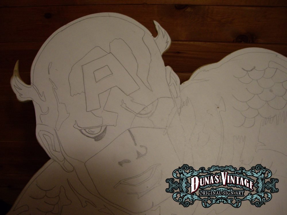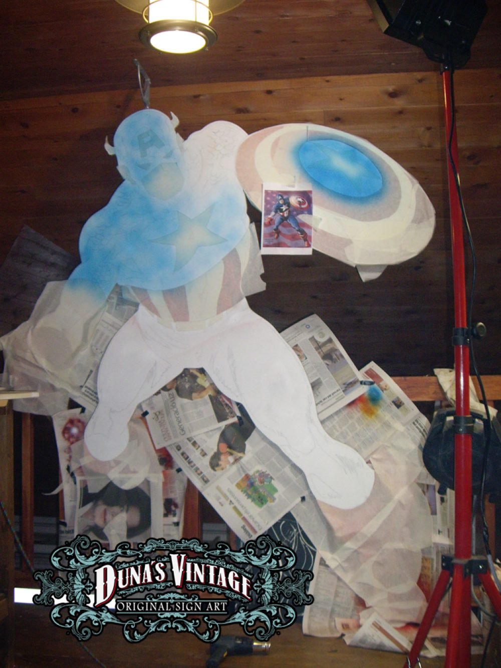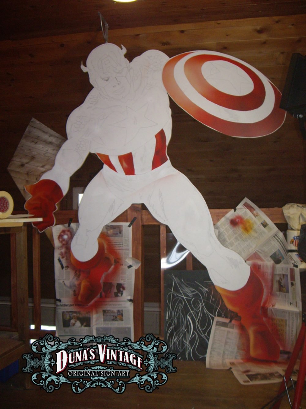 Esta figura del Capitan America trabajada en madera de DM a tamaño 2500x1900mm pintado con aerografo y perfilado a pincel, con iluminación en todo el contorno de la figura. Duna´s Vintage.