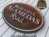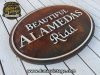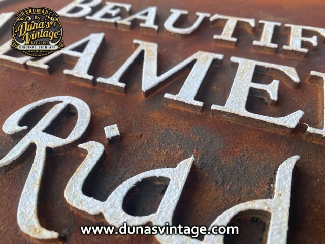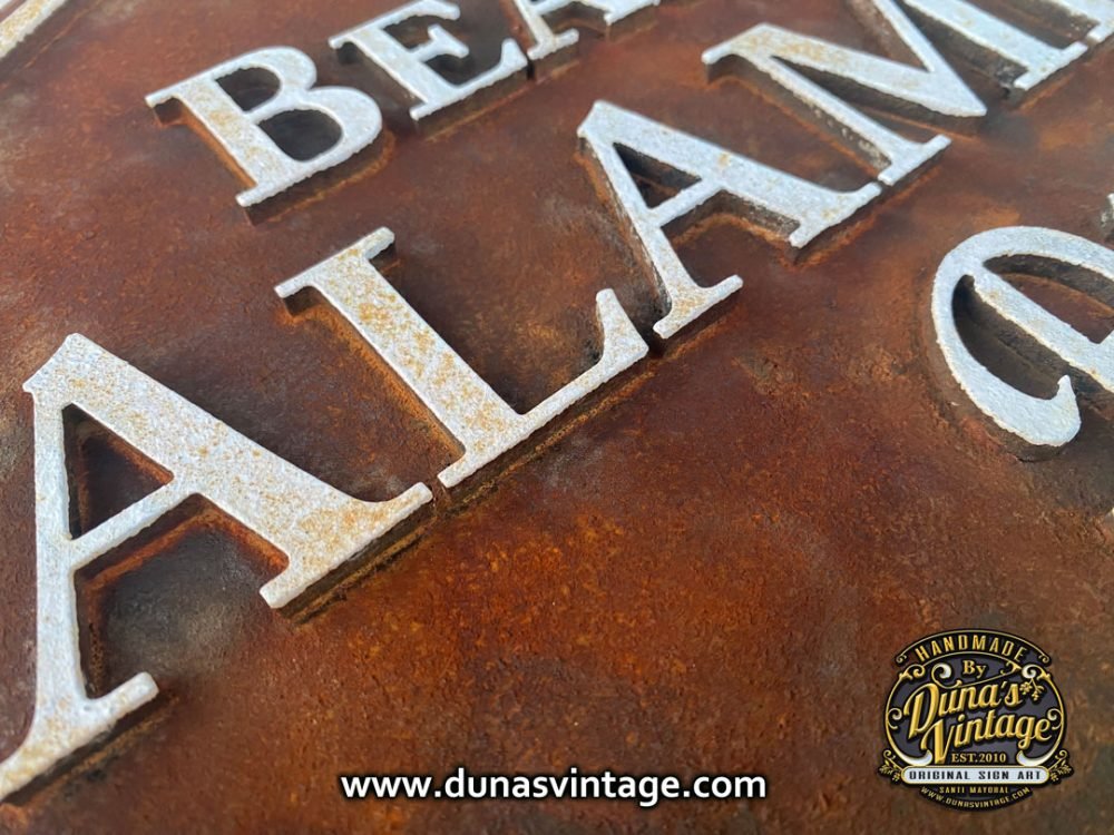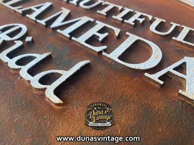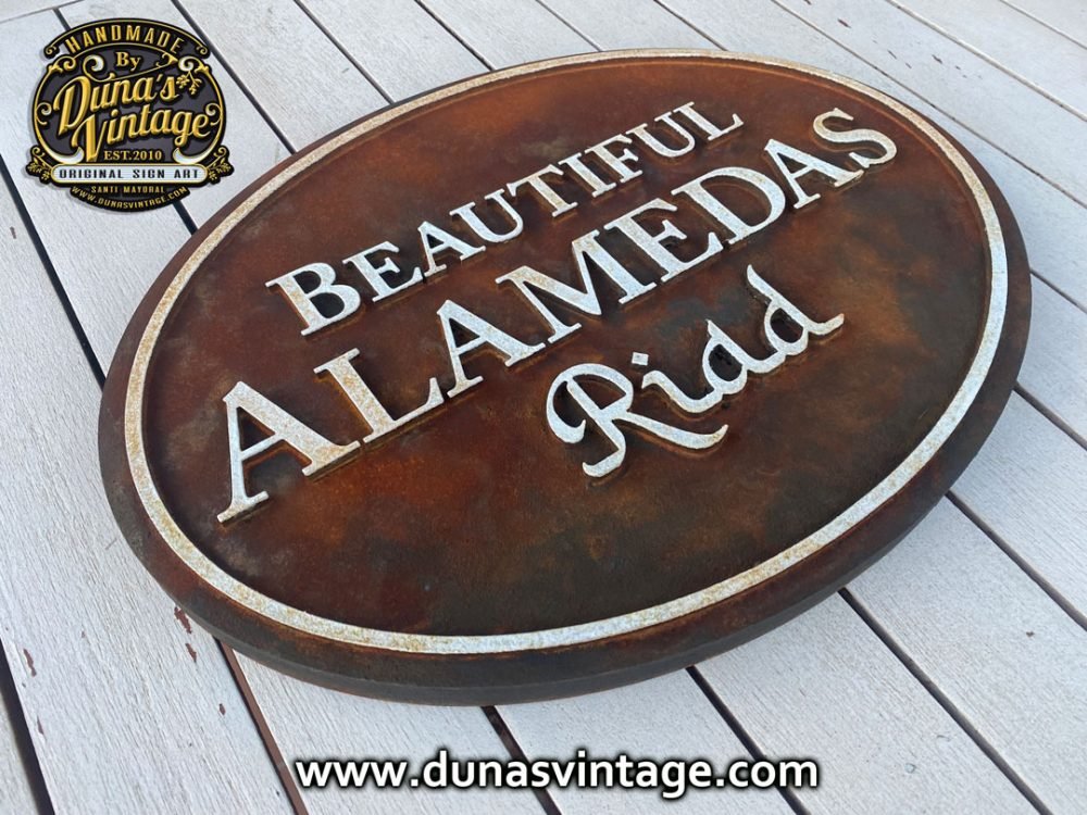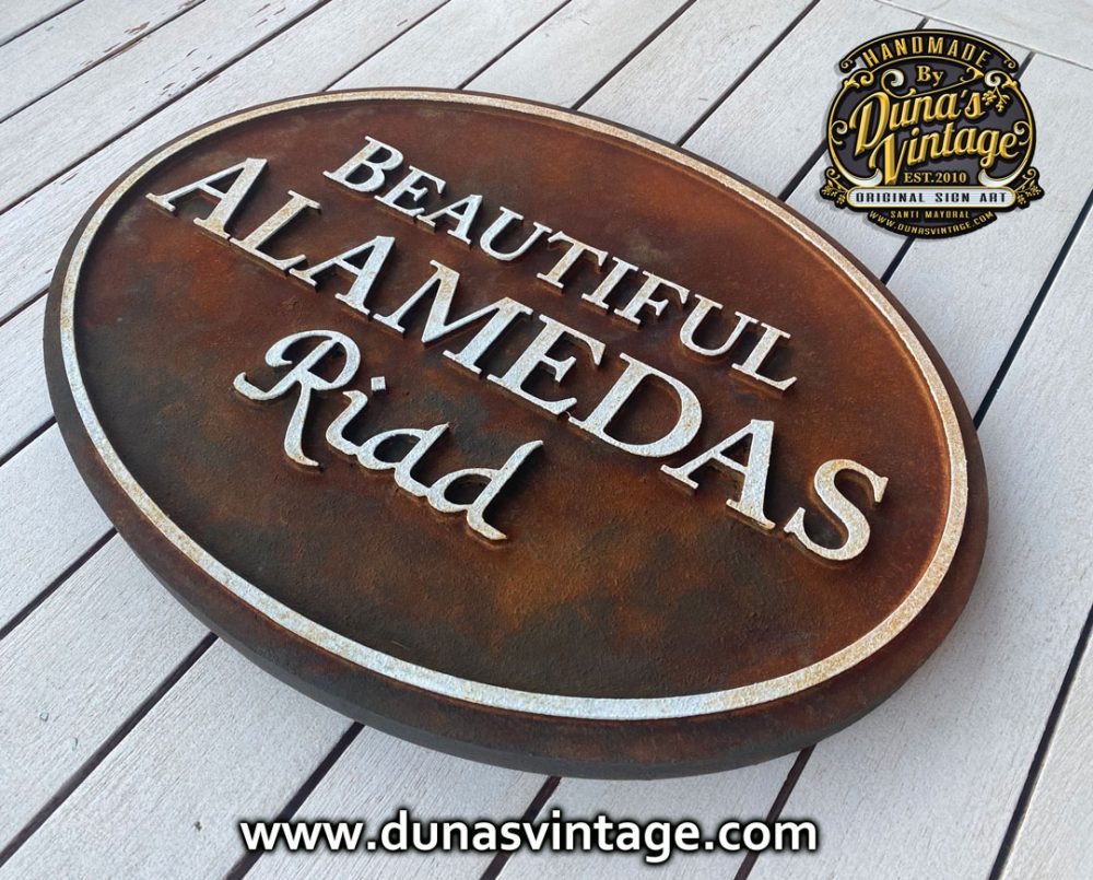 Aquí os dejo un cartel en fabricado en PVC de 19mm con letras en relieve, como podéis apreciar en las fotos se a trabajado con la técnica de oxidación para darle la apariencia de hierro oxidado, este cartel de Beautiful Alamedas Riad forma ovalada de tamaño 400x300mm.