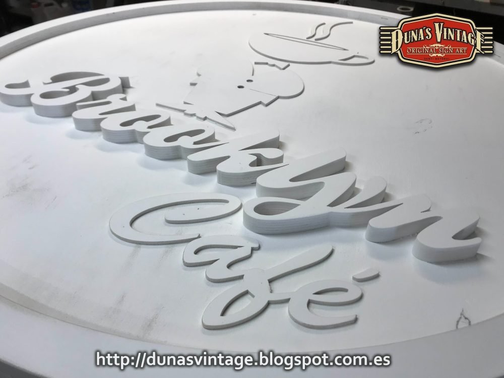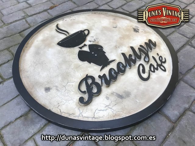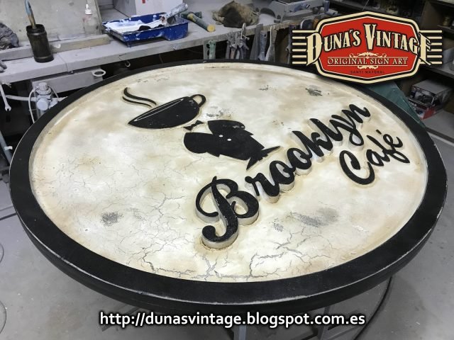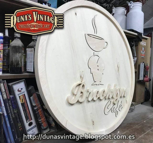 Cartel de madera tamaño 100cm de diámetro para nuevo Café en las Baleares, esta trabajado en madera con diferentes relieves en madera y acabado Vintage.