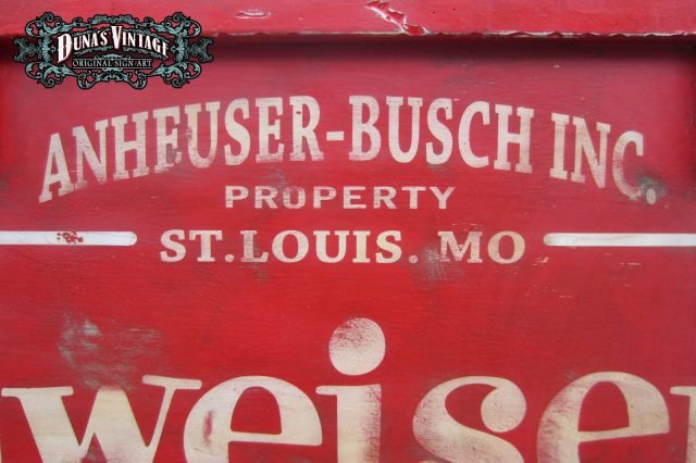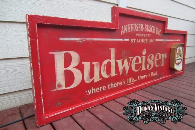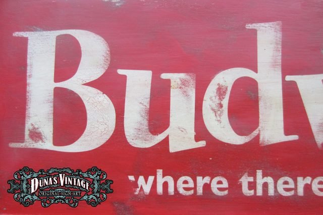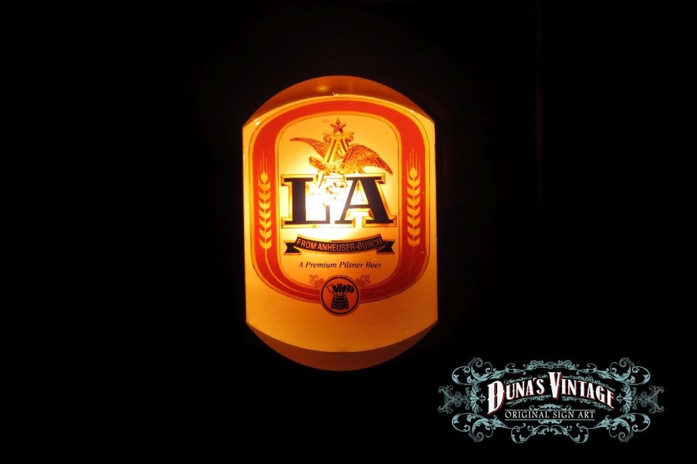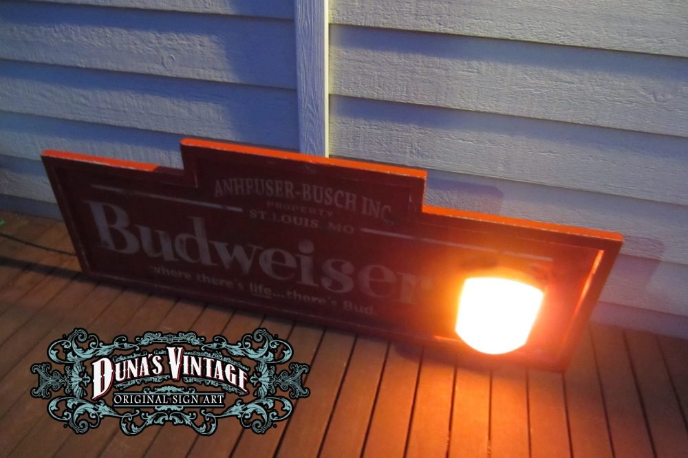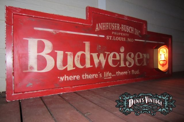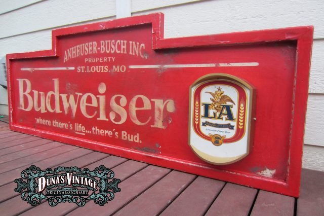 Cartel de Madera «Budweiser LA Luminoso» tamaño 600X1700mm. Cartel de los años 50 con emblema luminoso en la parte derecha del cartel, este cartel esta tratado con el efecto Retro que Duna´s Vintage que emplea en sus carteles.