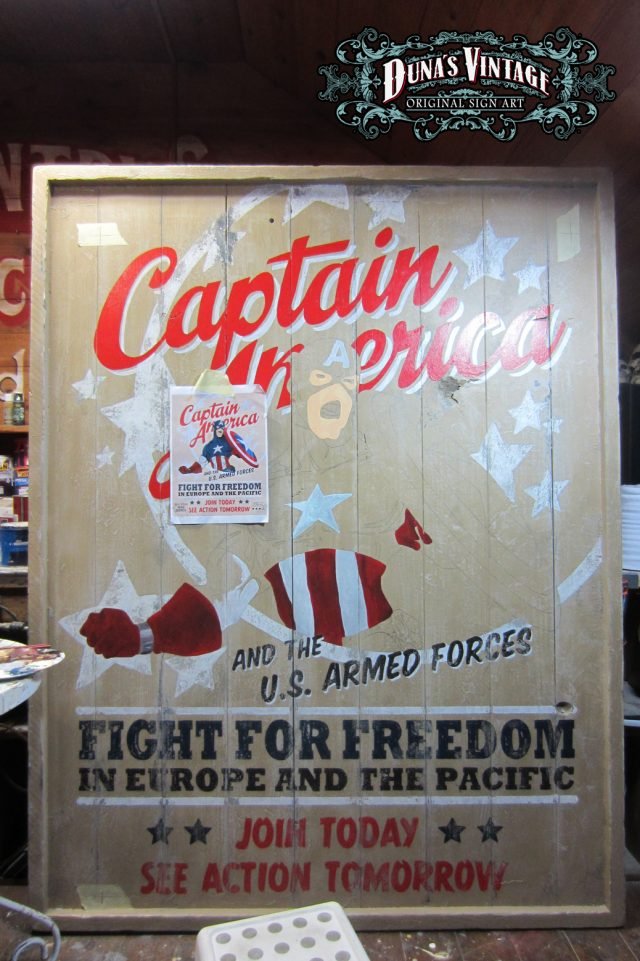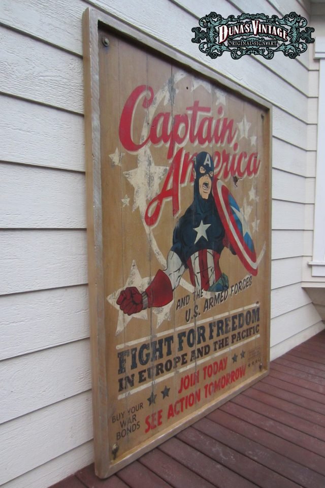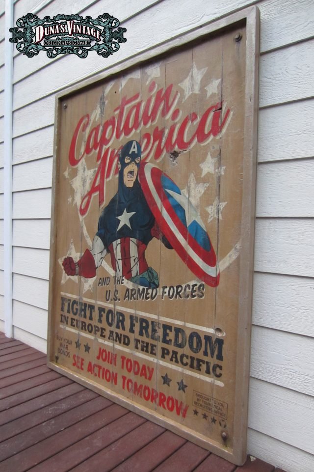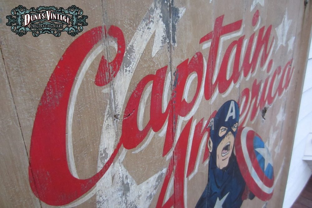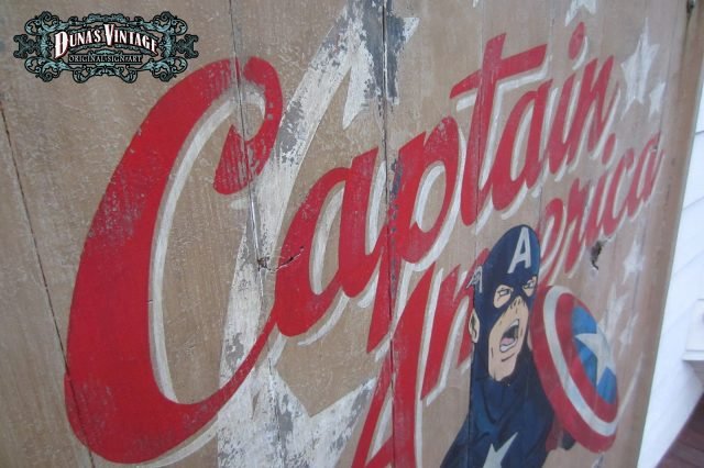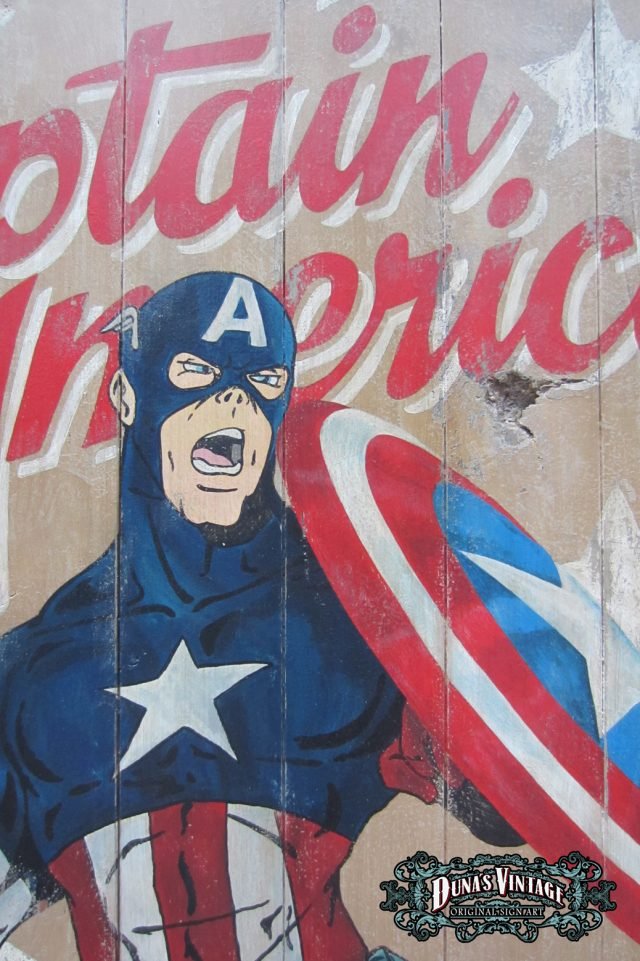 Cartel «Captain America Poster» tamaño 1270x1630mm. Este cartel esta tratado con el efecto Retro que Duna´s Vintage emplea en sus carteles pintados a mano.
