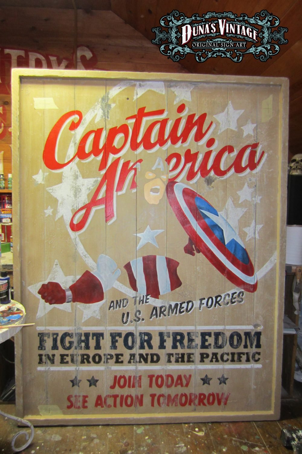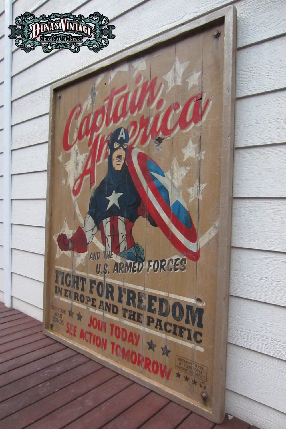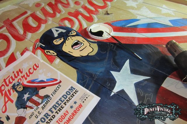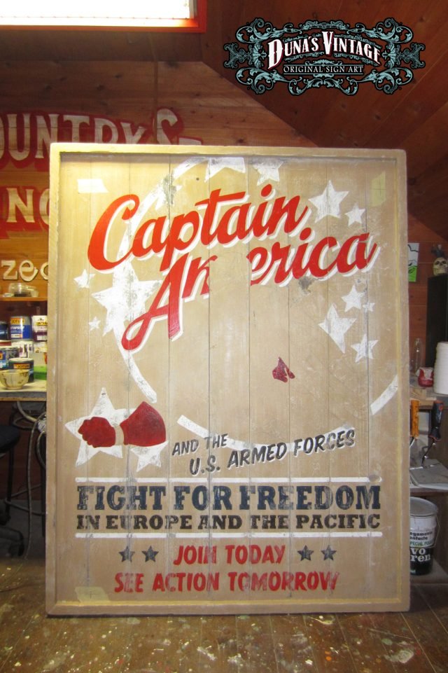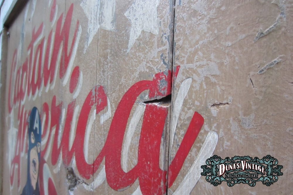 Cartel «Captain America Poster» tamaño 1270x1630mm. Este cartel esta tratado con el efecto Retro que Duna´s Vintage emplea en sus carteles pintados a mano.