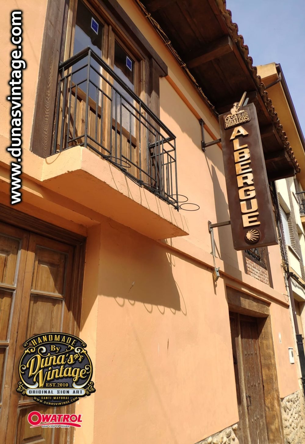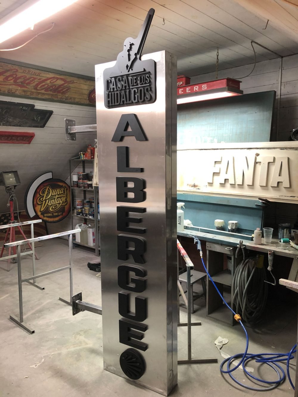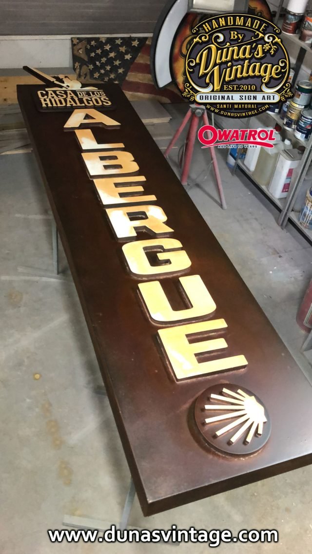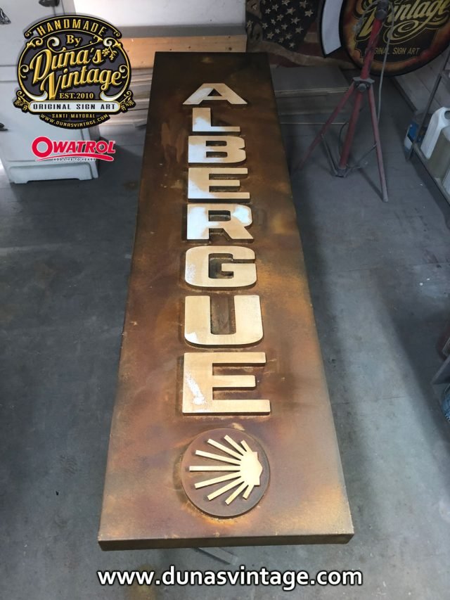 Este cartel se ha ido para el camino de Santiago, esta trabajado con estructura de hierro y bandejas en aluminio con las letras en P.V.C negro en diferentes relieve y luego se le a dado un acabado oxido al todo el cartel para darle la apariencia de oxidado, tamaño 2000x500mm.