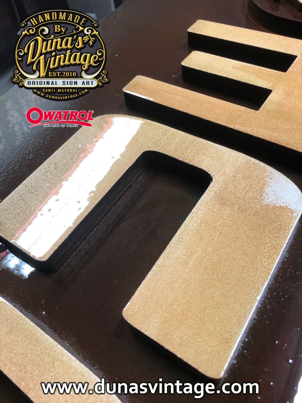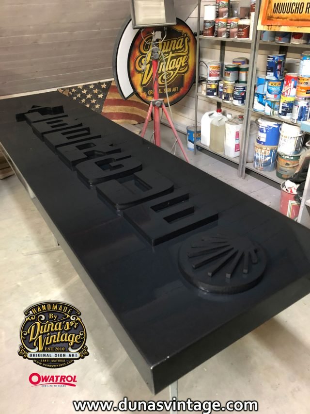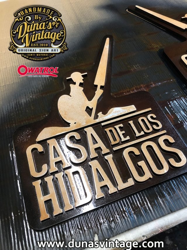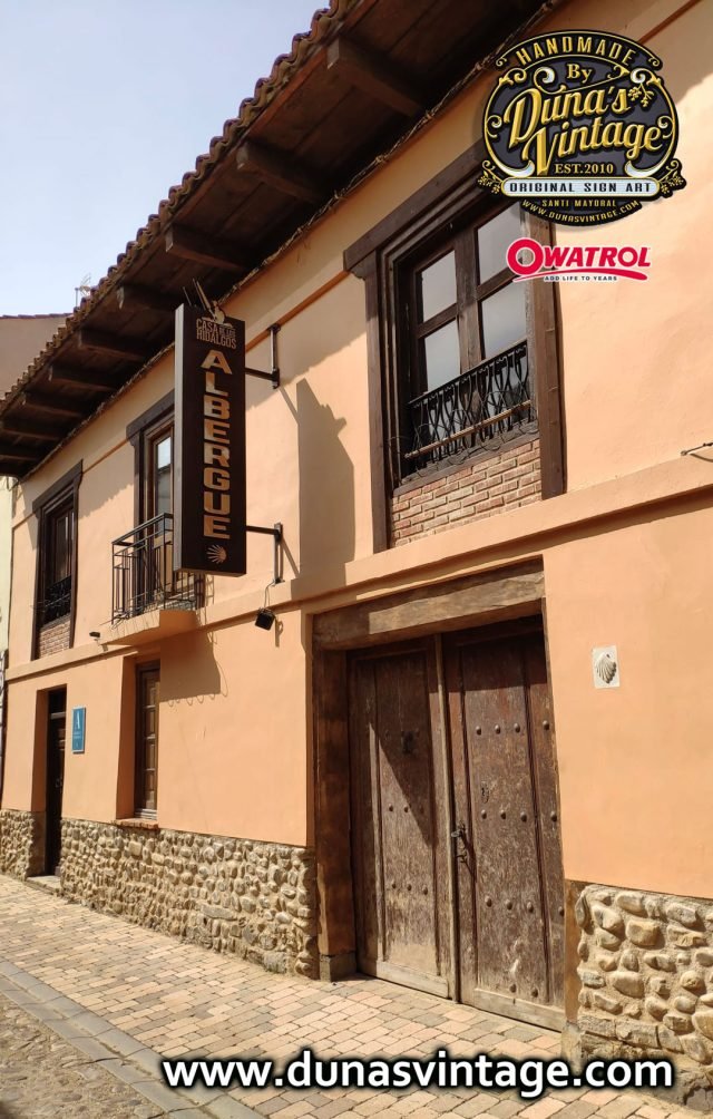 Este cartel se ha ido para el camino de Santiago, esta trabajado con estructura de hierro y bandejas en aluminio con las letras en P.V.C negro en diferentes relieve y luego se le a dado un acabado oxido al todo el cartel para darle la apariencia de oxidado, tamaño 2000x500mm.