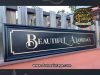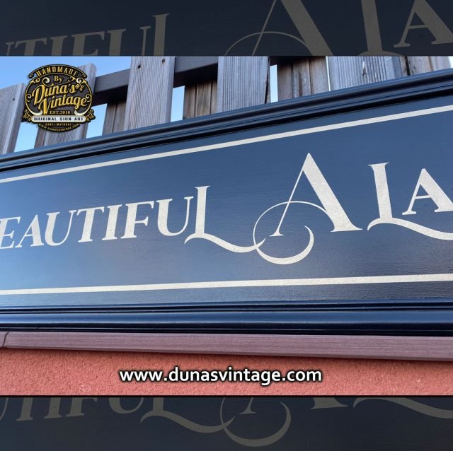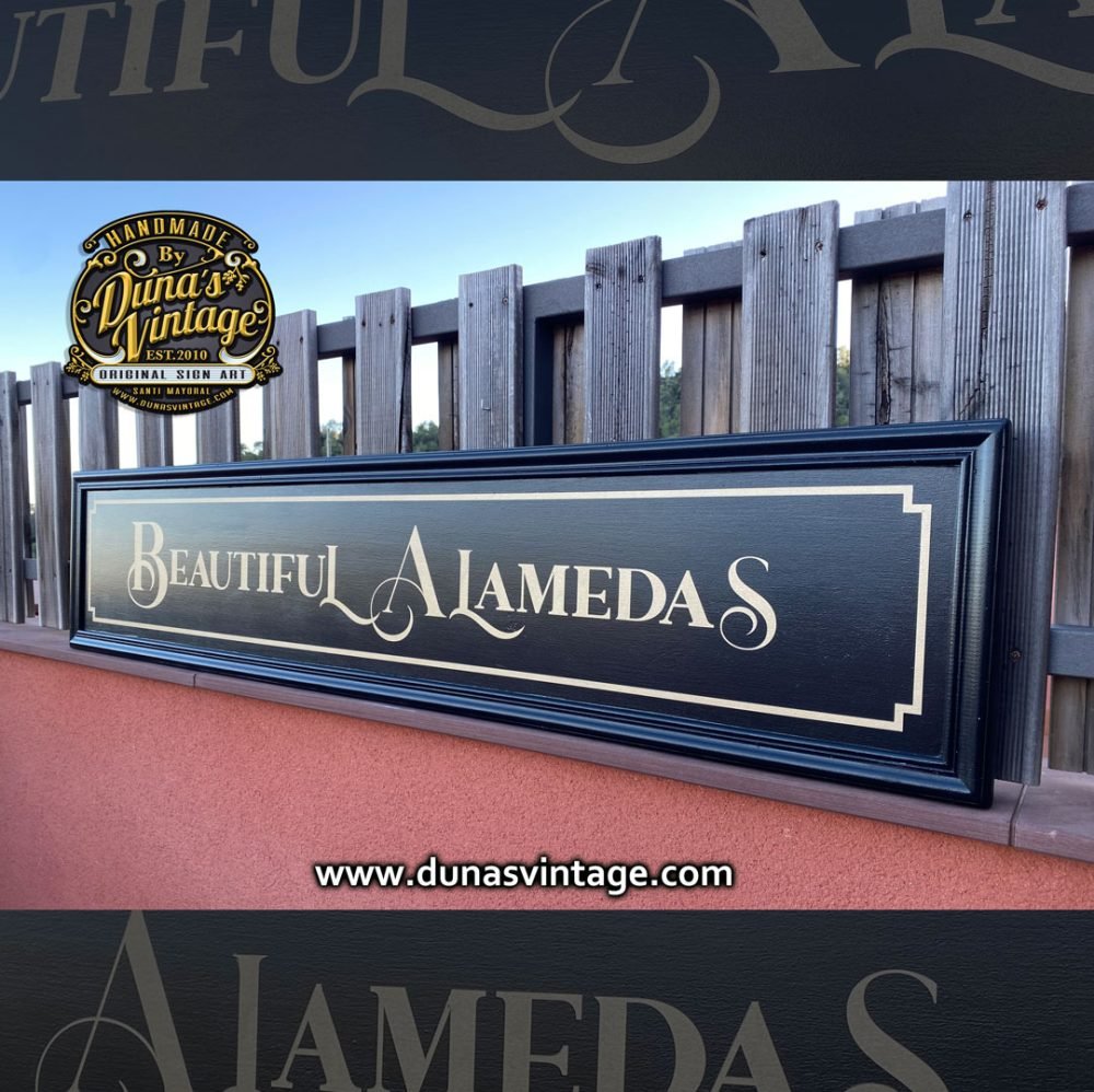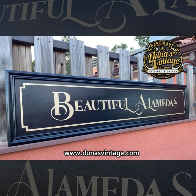 Cartel de madera Beautiful Alamedas tamaño 145x31cm, trabajo en madera contrachapado de 18mm para exterior. No siempre tienen que tener un acabado Vintage, en este caso se ha trabajado fondo negro y letras en oro como si fuese un cartel nuevo, pero con un aire clásico.