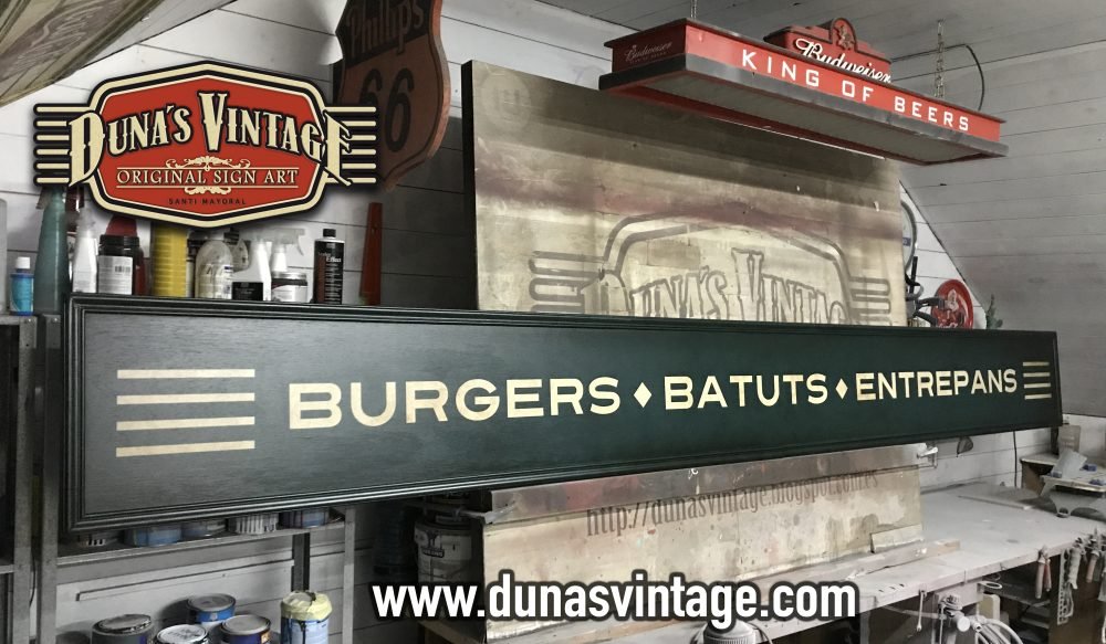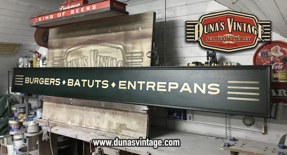 Cartel de Madera Bernie´s Burgers, Batuts, Entrepans tamaño 3580x380mm en contrachapado de madera de 15mm.