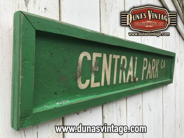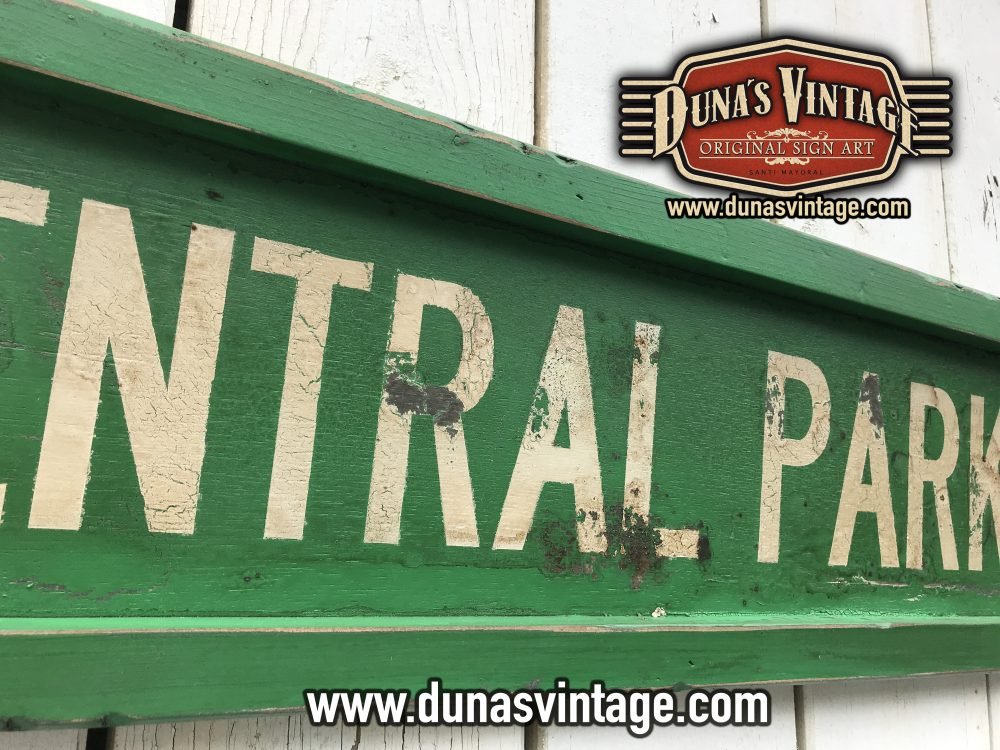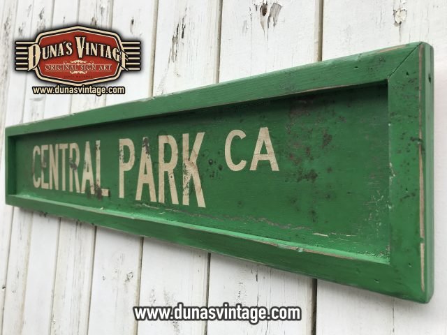 Cartel de madera de 15mm pintado a mano con efecto envejecido para darle la apariencia de viejo y desgastado por el tiempo Ref. CENTRAL PARK CA. tamaño 1000x200mm.