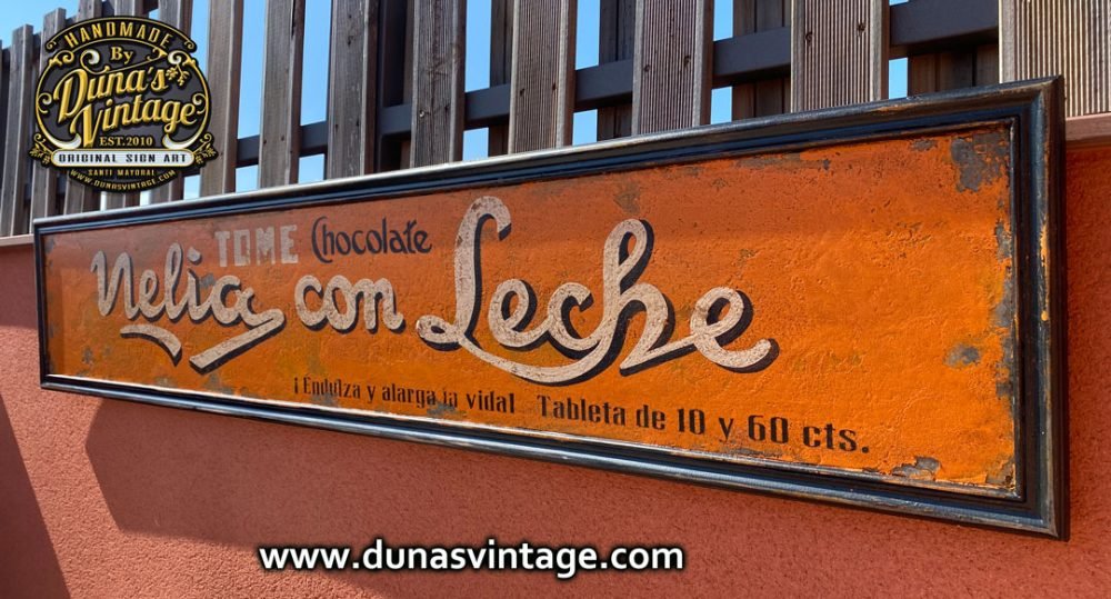 Cartel de Madera pintado a mano, tamaño 1750x335mm. Esta marca de Chocolates Bombardeo Barcelona con chocolatinas a finales de 1929, Esta fue una de las primeras y la más original sin duda iniciativas de publicidad aérea de la historia de España. Los excéntricos propietarios de la fábrica de chocolates Nelia compraron un de Havilland Moth pintado con paneles publicitarios de su producto. El avión fue cargado con cajitas con chocolates unidas a diminutos paracaídas, y bombardeó las playas de la Barceloneta con toda esta munición. En venta en la tienda de Duna´s Vintage. En venta en la tienda de Duna´s Vintage, https://dunasvintage.com/stock-carteles/cartel-de-madera-chocolates-nelia-1928/