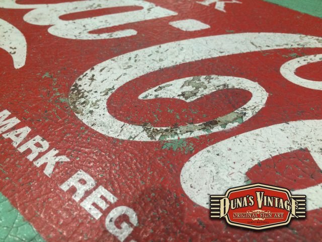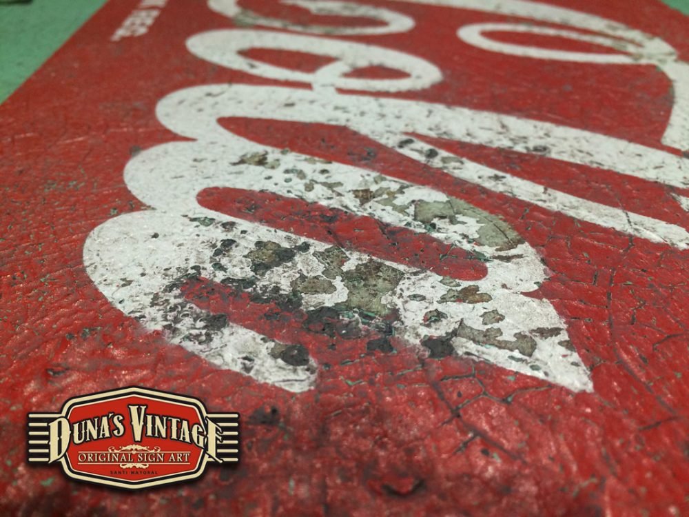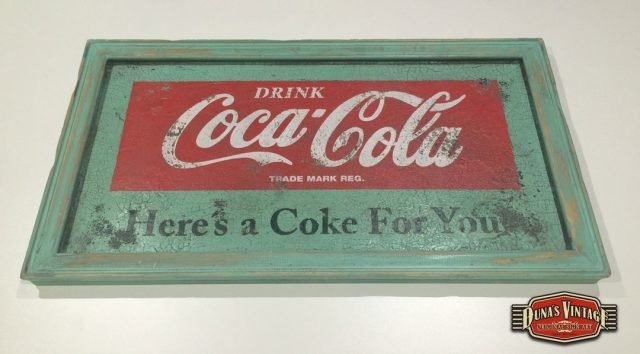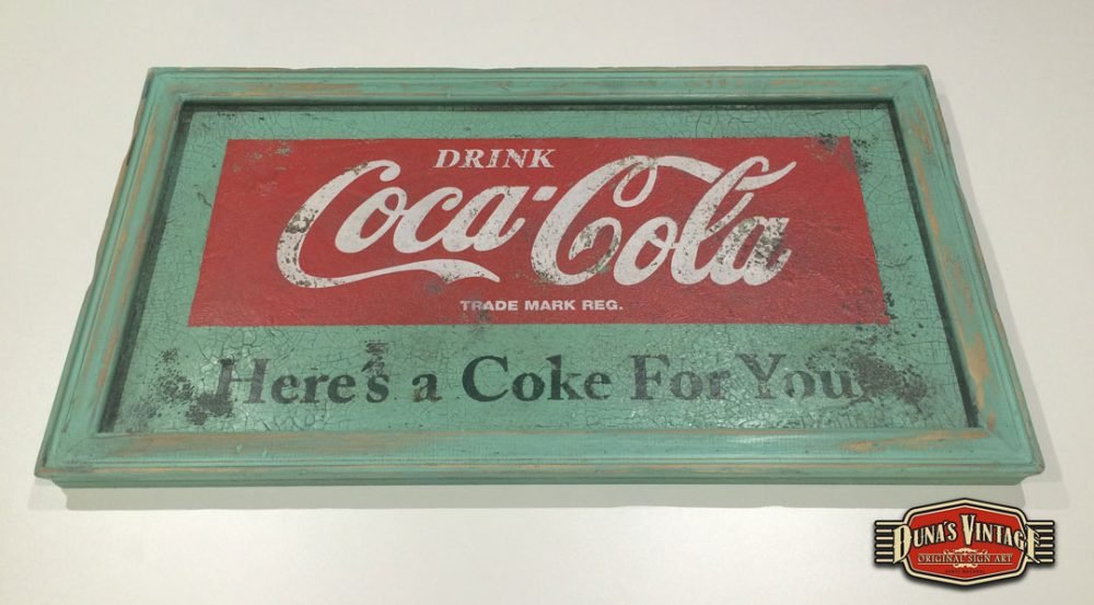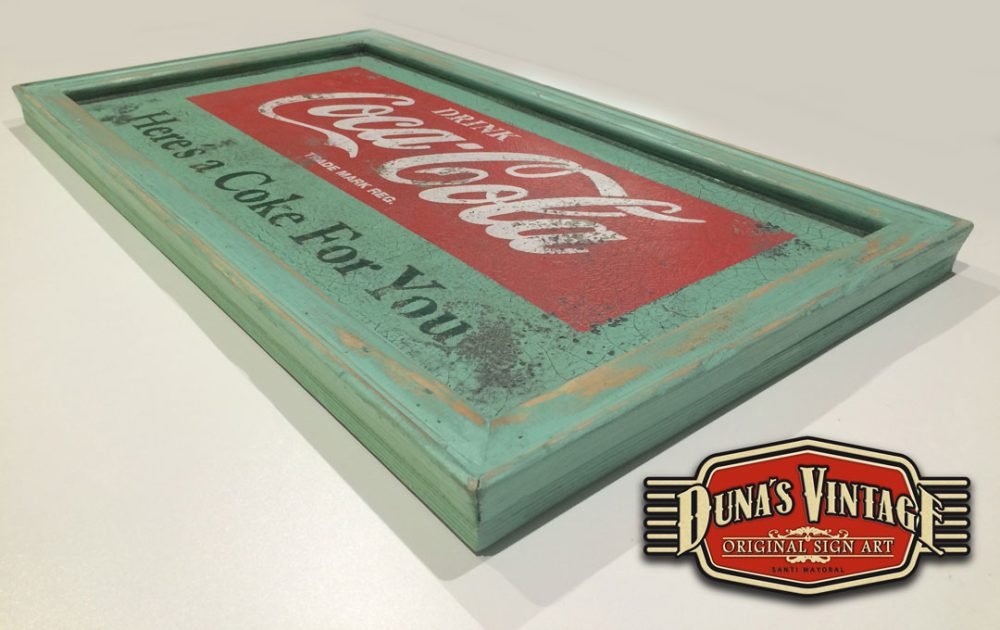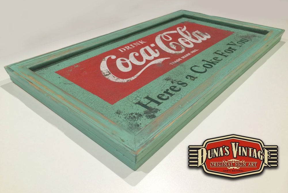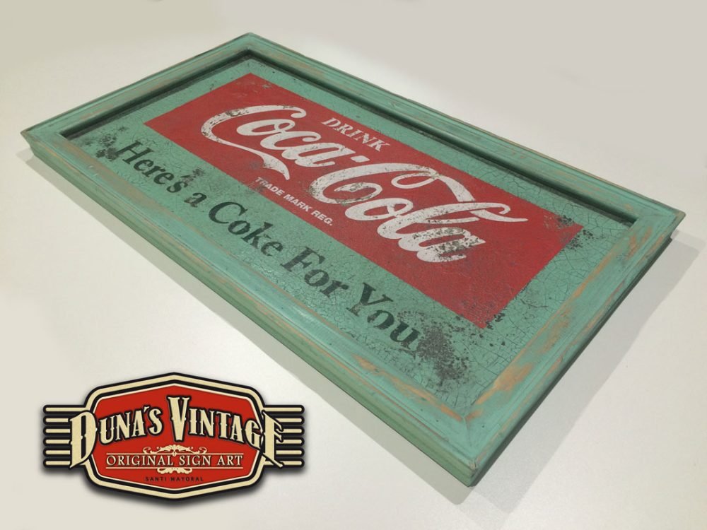 Cartel de Madera pintado a mano con efecto envejecido tamaño 800x450mm, imagen de la marca de los años 55 que podíamos encontrar en los establecimientos donde se vendía Coca-Cola.