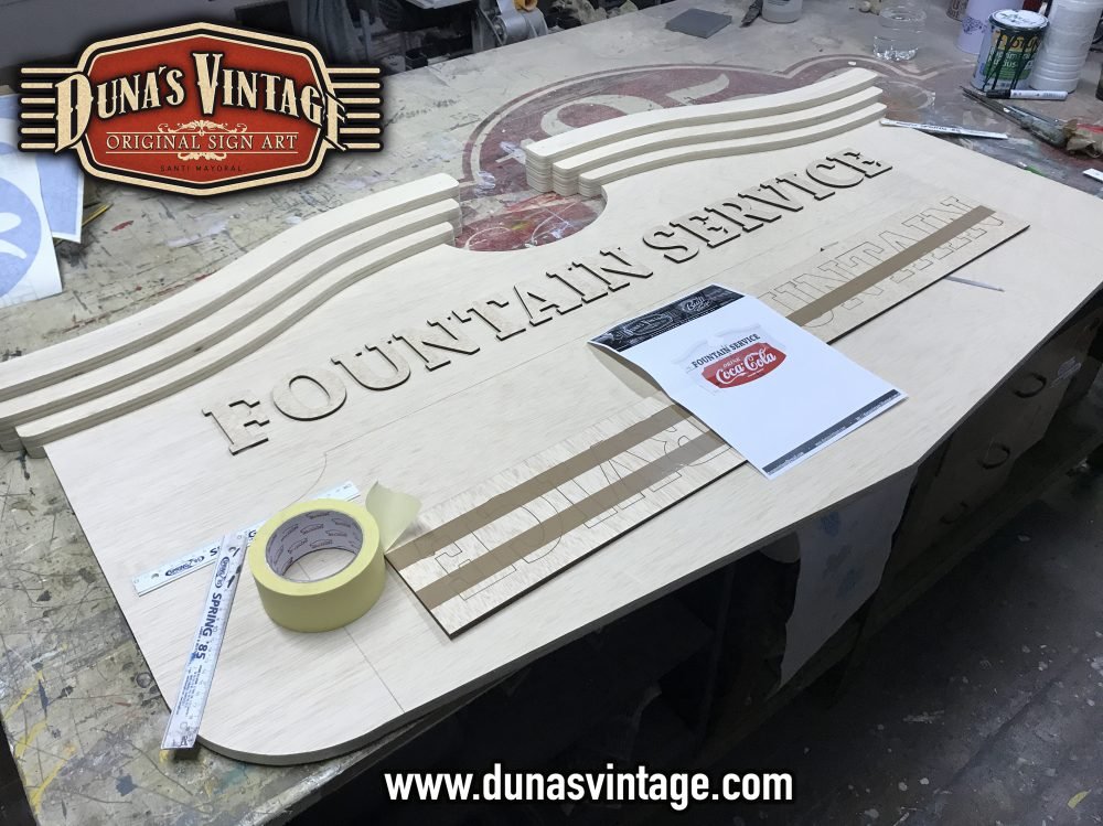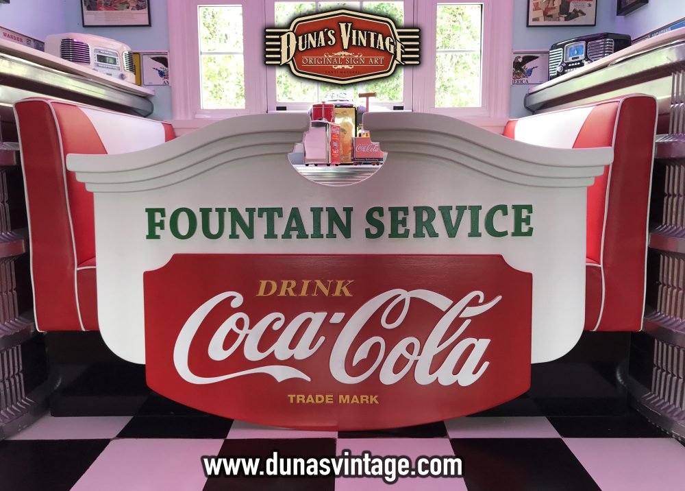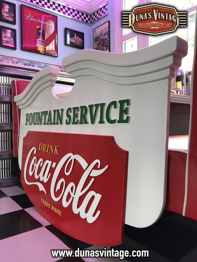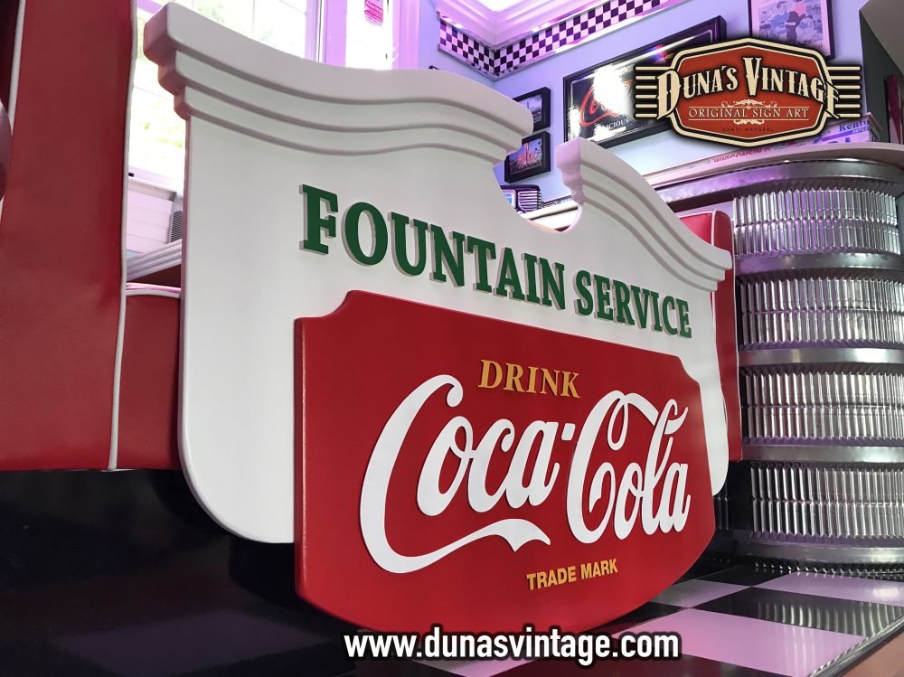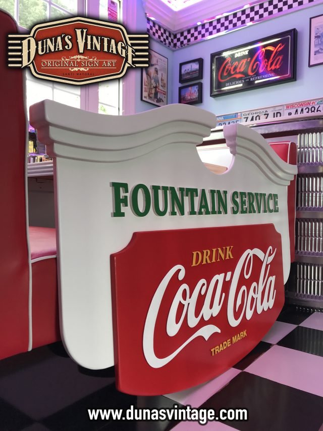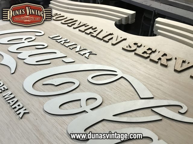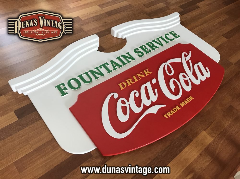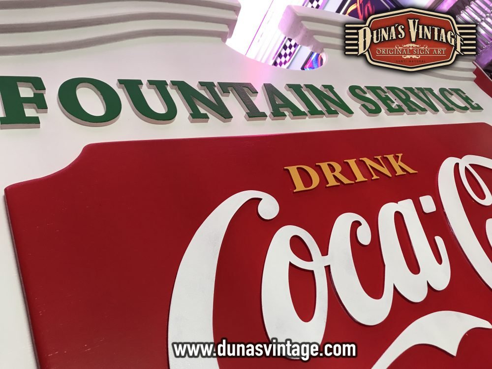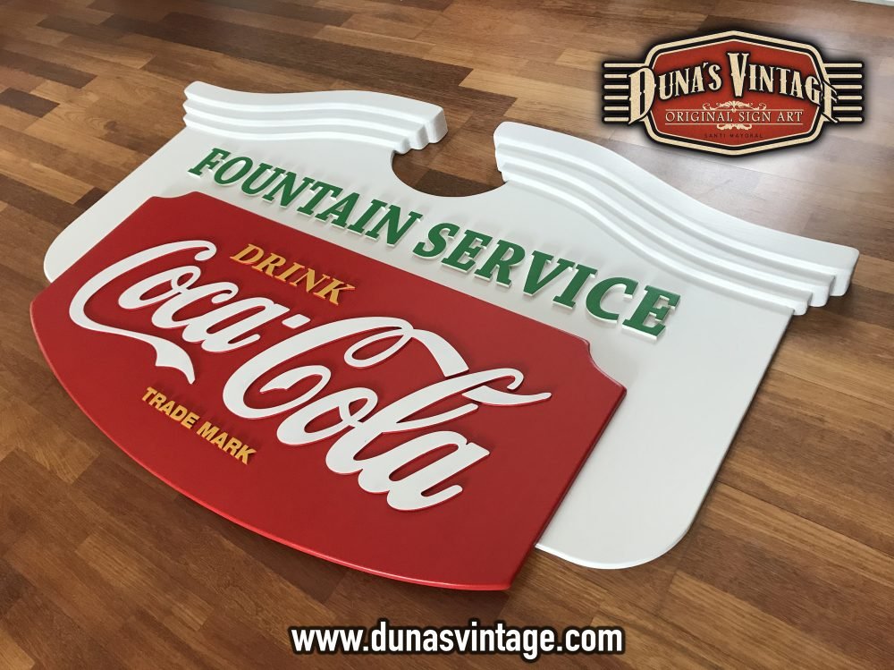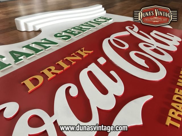 Este cartel de Coca-Cola lo podíamos encontrar en los años 50 en bares de Estados Unidos, esta trabajado en diferentes gruesos de madera para conseguir el volumen deseado, las letras están echas en relieve de 4 y 8mm de grueso, el tamaño es de 1500x900mm y el acabado en este cartel no es efecto Vintage si no nuevo.