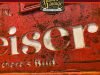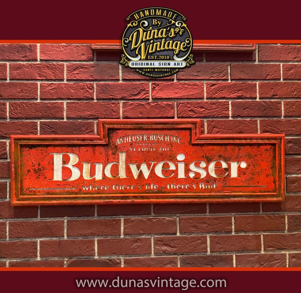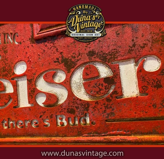 Cartel de madera con efecto óxido de BUDWEISER, tamaño 96×30 cm. Aquí os presento un cartel de madera pintado a mano, con relieve y un acabado en efecto óxido. Su proceso de creación es meticuloso y puede tardar hasta una semana en lograr la textura deseada, rompiendo y desgastando la pintura poco a poco para darle ese toque de óxido y desgaste natural. El resultado es una pieza única y original, con un carácter y aspecto inigualables.