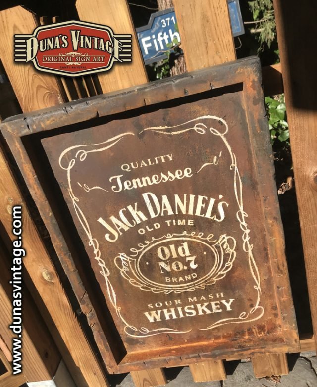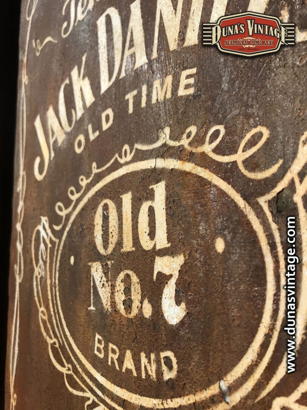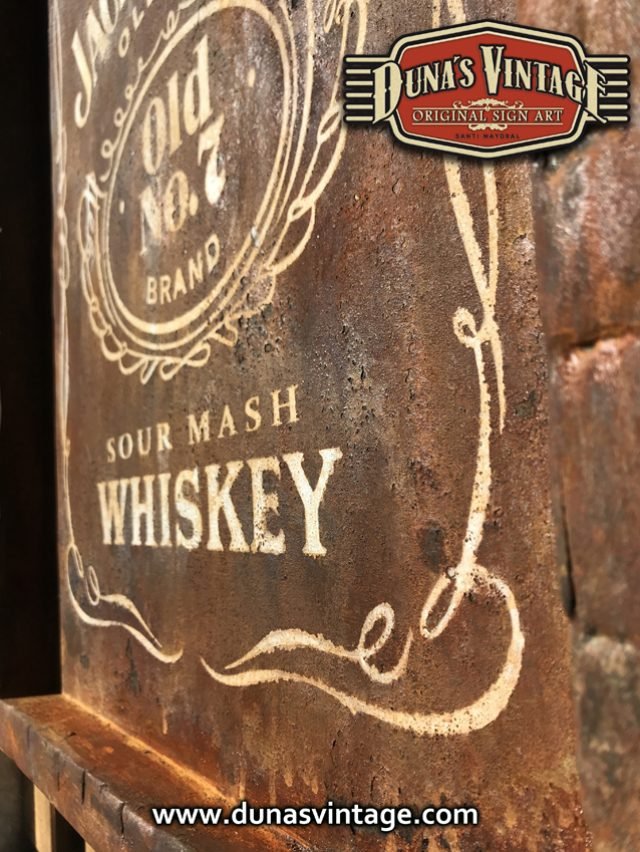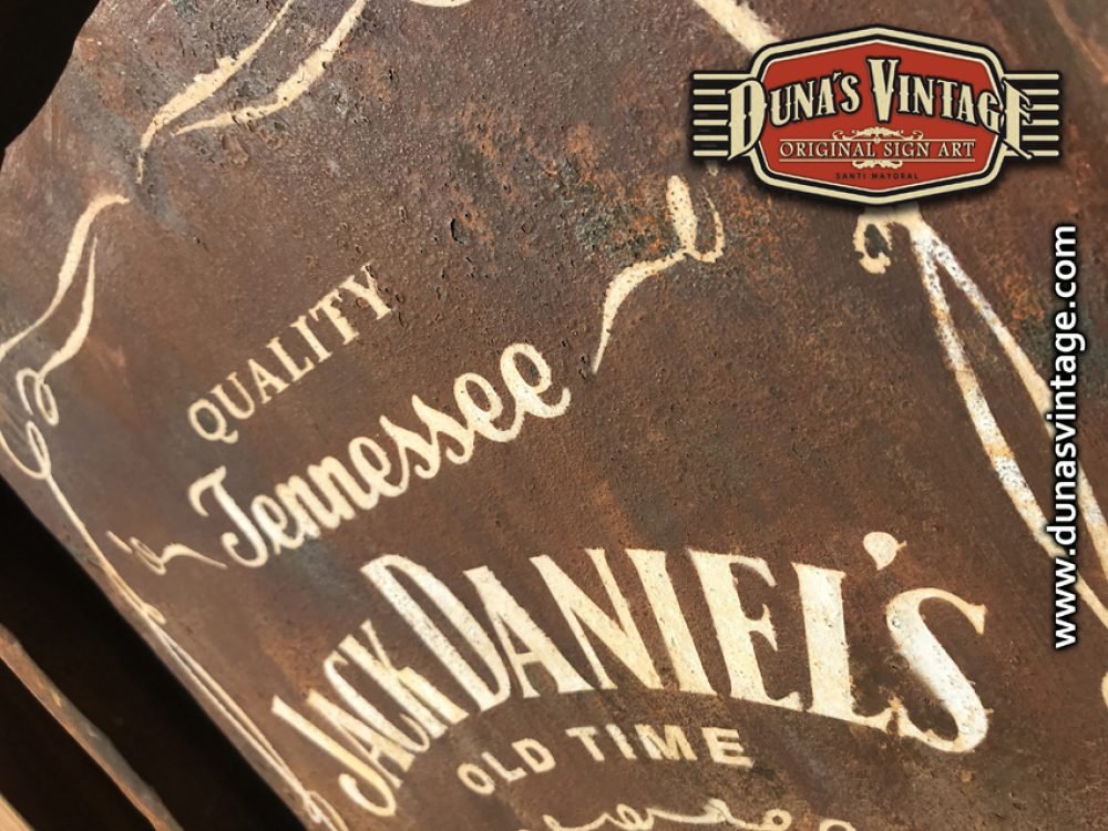 Cartel pintado a mano sobre madera contrachapado de 18mm con efecto metal oxidado JACK DANIEL´S tamaño 450x620mm.