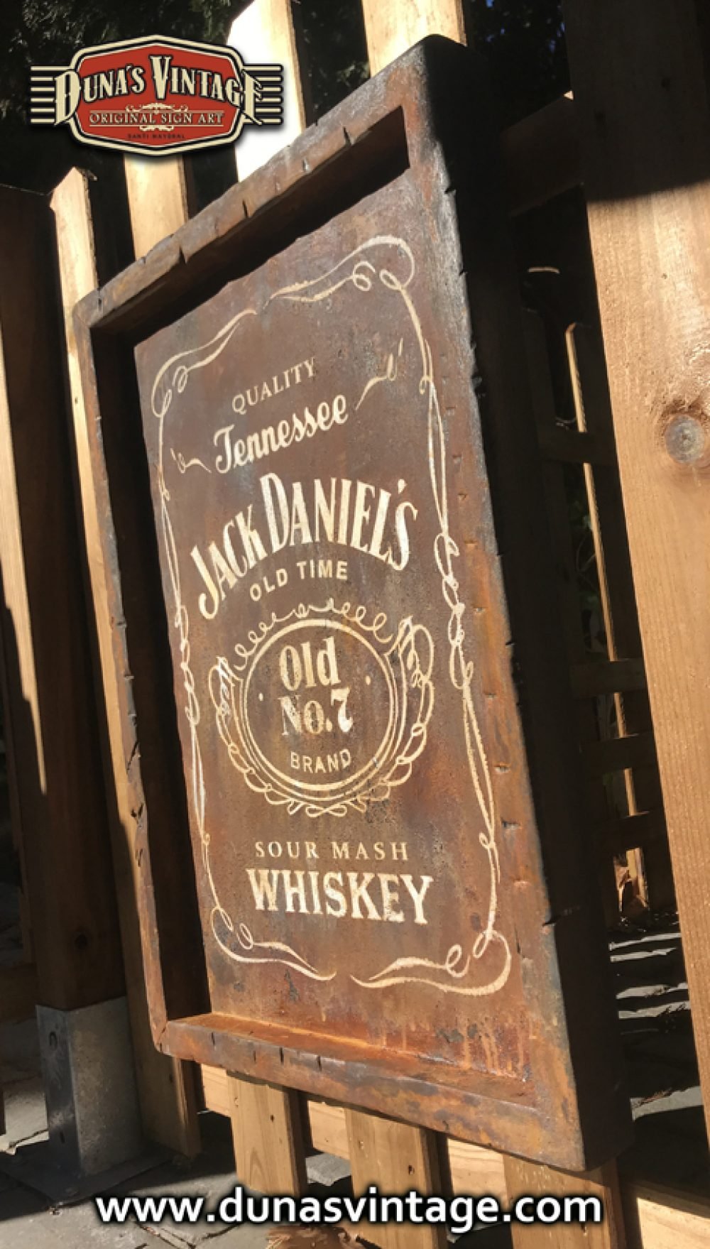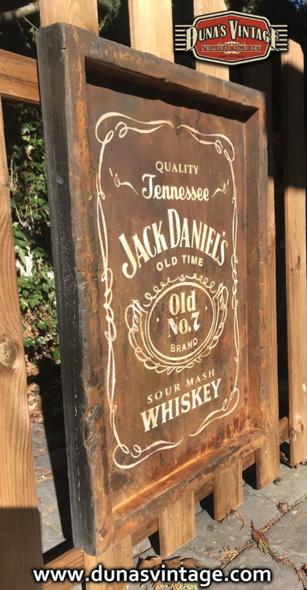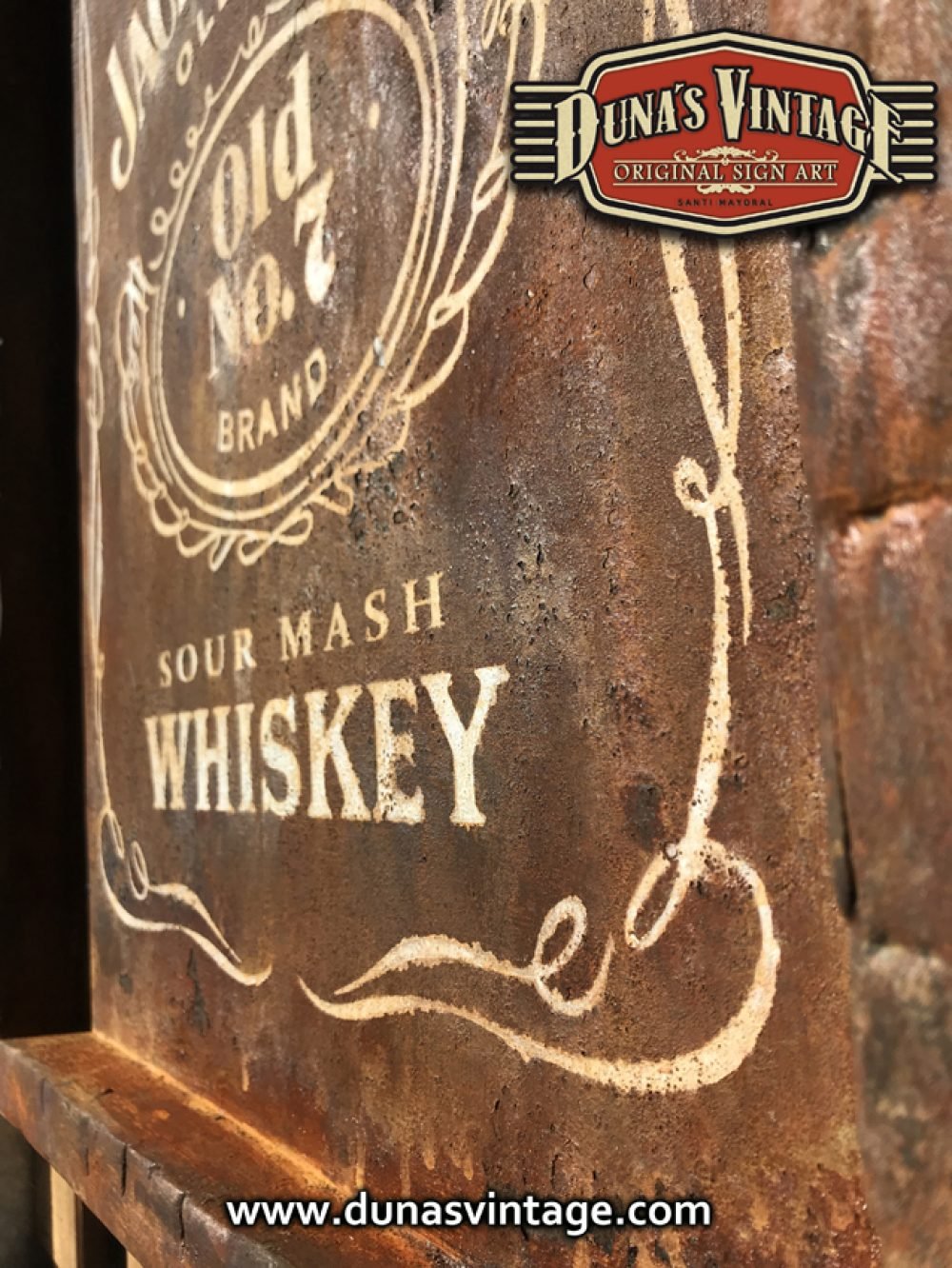 Cartel pintado a mano sobre madera contrachapado de 18mm con efecto metal oxidado JACK DANIEL´S tamaño 450x620mm.