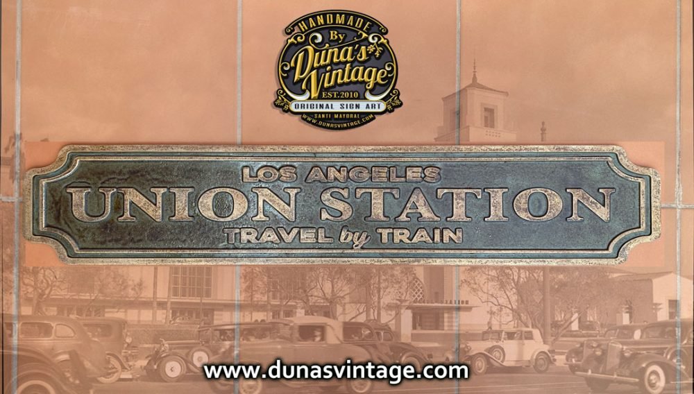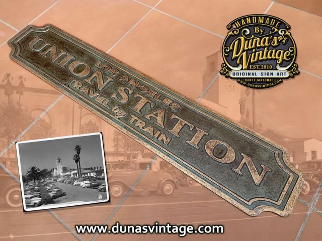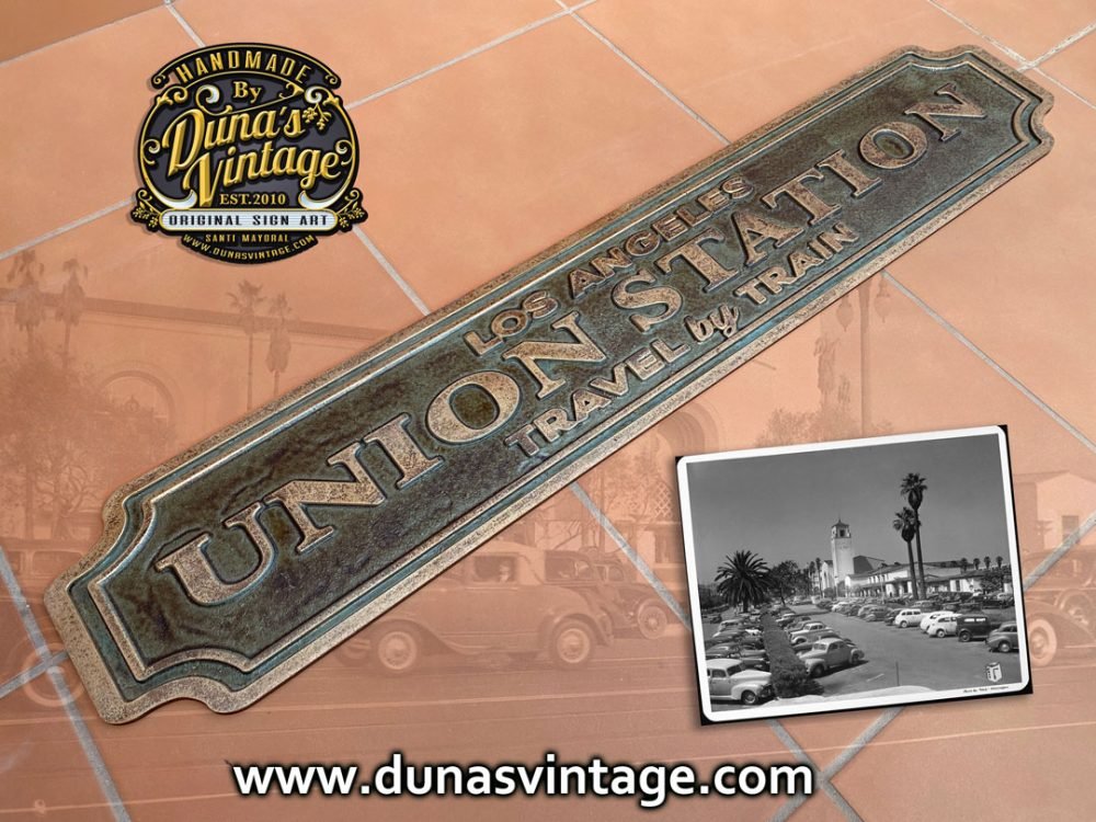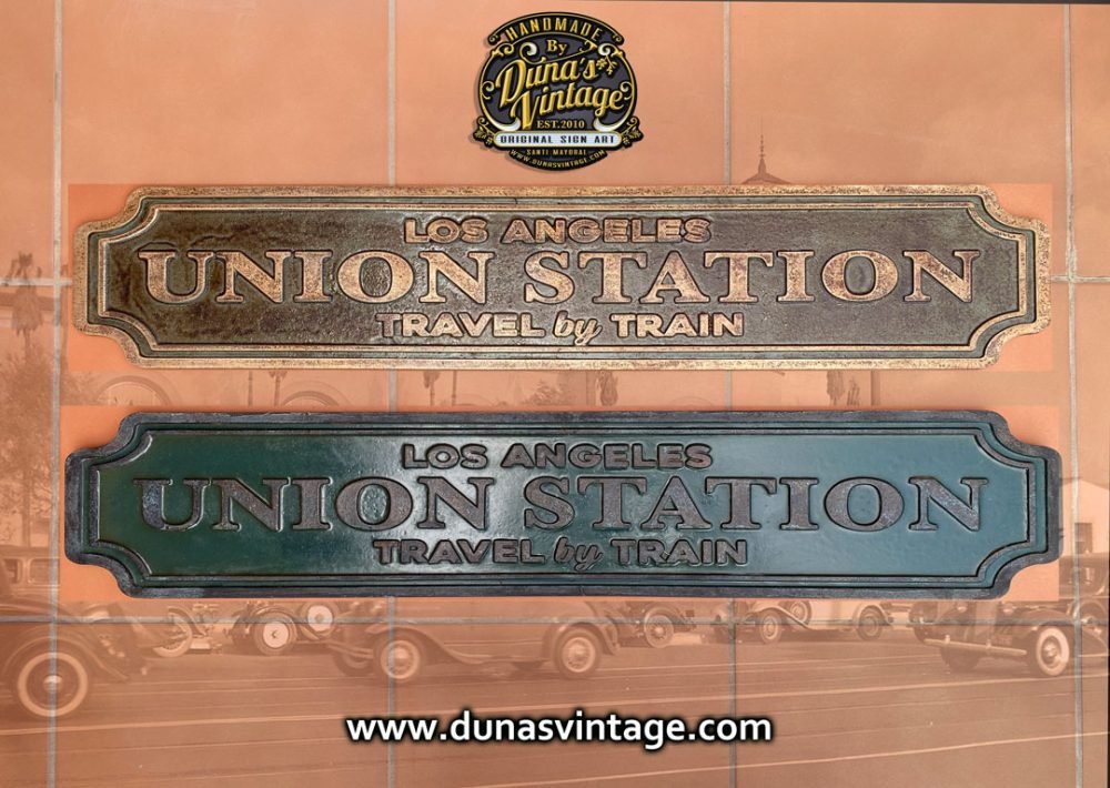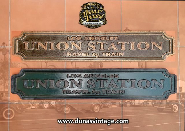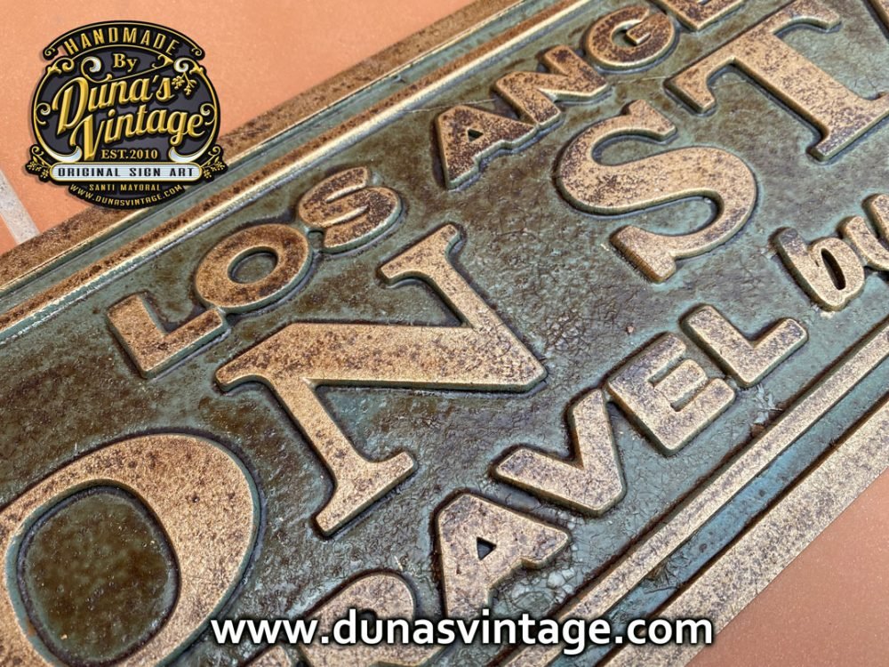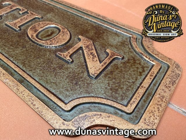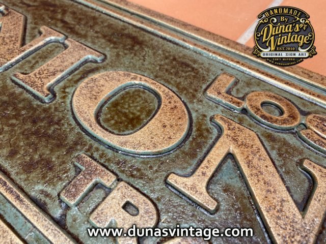 En este cartel se ha querido conseguir el efecto de una placa en Oro viejo, con su patina con tonos verdes y marrones, en las fotos no se aprecia muy bien, pero al natural ha quedado muy bien. Tamaño de la placa es de 963x182mm. En venta en la web de Duna´s Vintage.