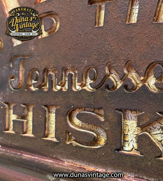 Cartel de madera de DM de 8mm en relieve y efecto óxidado con acabado envejecido para darle la apariencia de una placa de hace muchos años, tamaño 95x30cm si quieres aprender estos efectos los encontraras en www.hacercartelesvintage.com