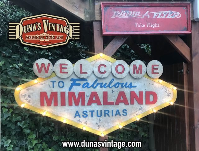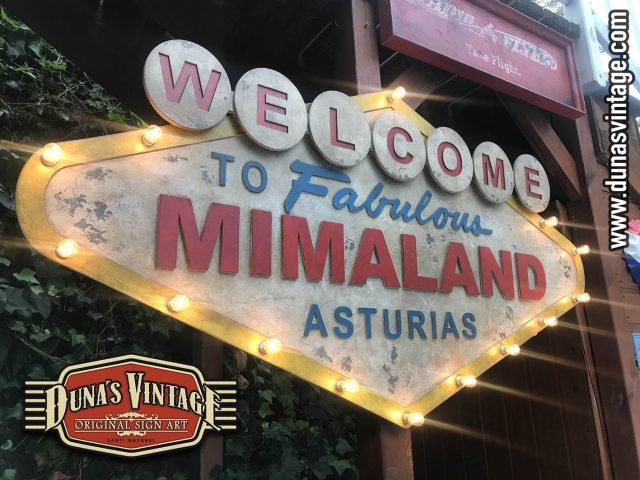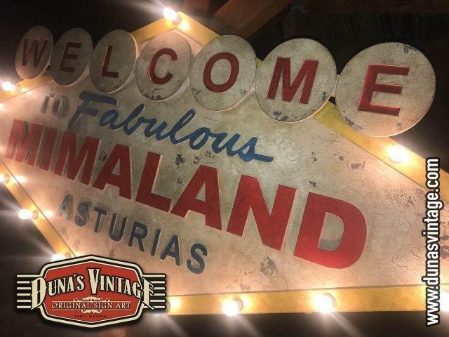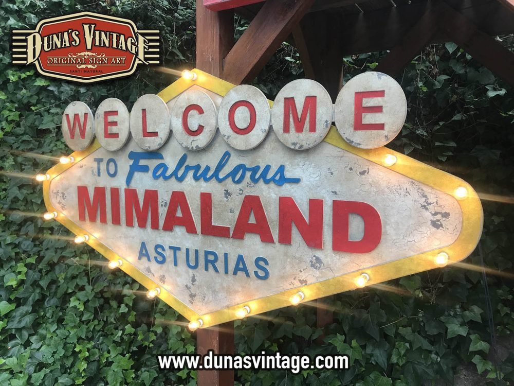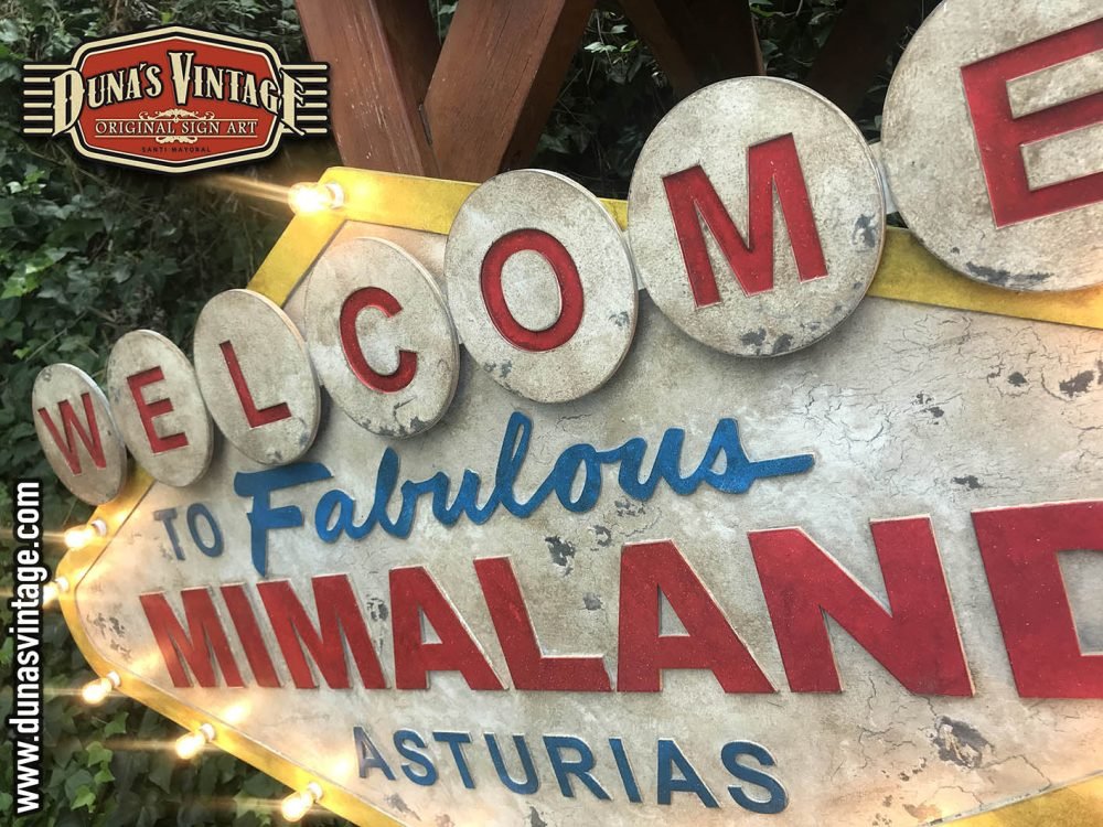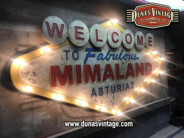 Cartel de Madera en relieve MIMALAND tamaño 1400x800mm, este cartel representa el cartel de Welcome Las Vegas pero con la marca del cliente en este trabajo se a añadido iluminación alrededor del cartel para darle un aire mas autentico (Gracias Marçel de The Font Hunter) y el cartel se a trabajado con el efecto Vintage que Duna´s Vintage emplea en sus carteles.