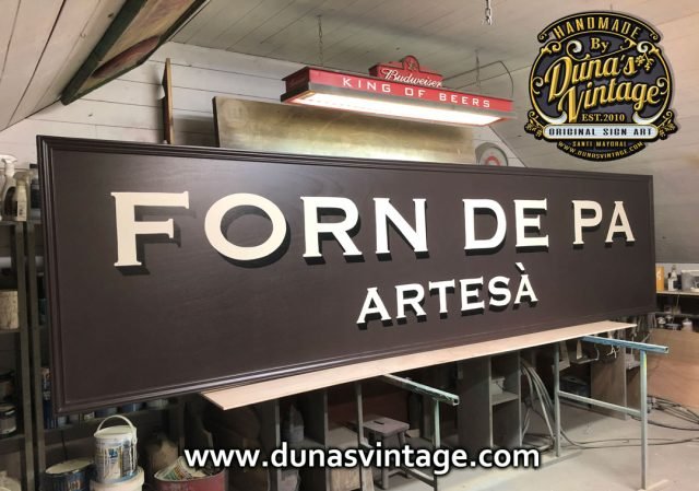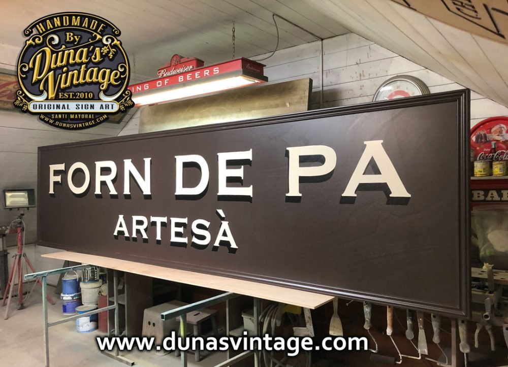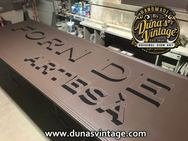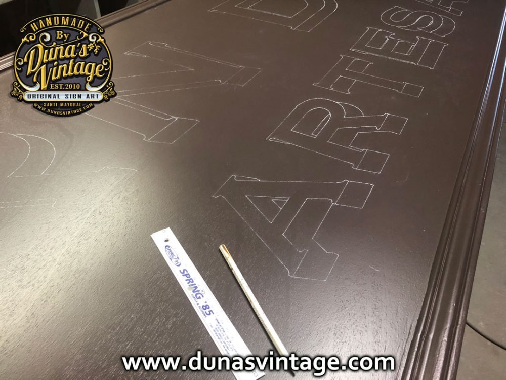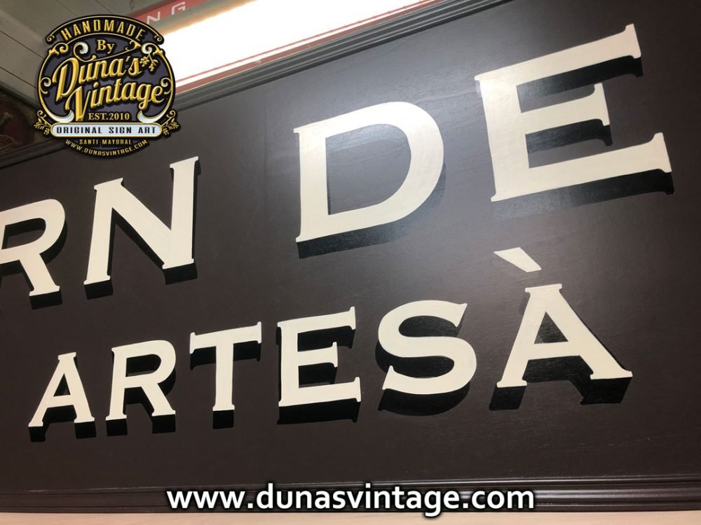 Primer cartel de año de grandes dimensiones. Cartel de Madera contrachapado de 20mm Tamaño 375x90cm por las dimensiones del cartel se a tenido que hacer en dos partes y encolar para tener las dimensiones de casi 4m de largo, pintado a mano con tipografía de la época.