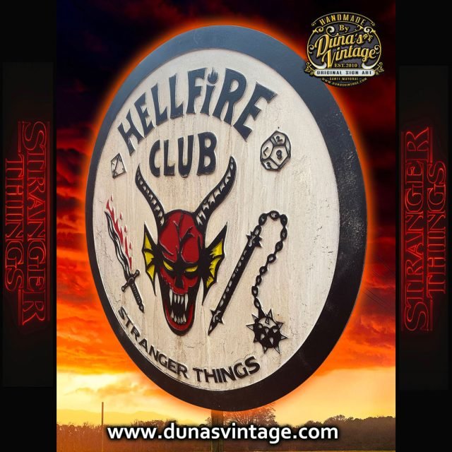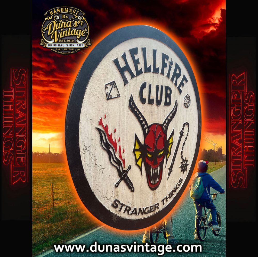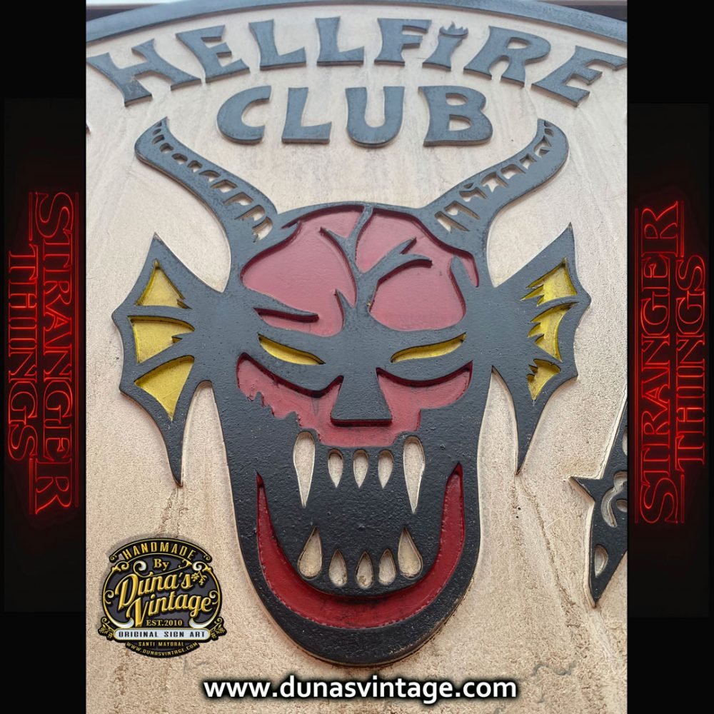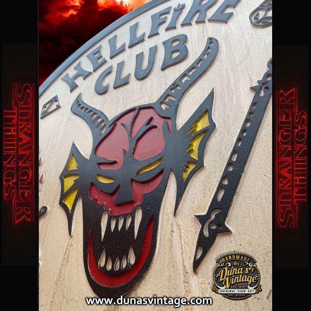 Aquí os dejo un nuevo cartel del club de STRANGER THINGS, fabricado en madera DM con relieve y pintado a mano con efecto envejecido, ideal para colgar en tu cuarto o estancia de tu casa. Tamaño 79cm de diámetro disponible en la tienda de Duna´s Vintage.