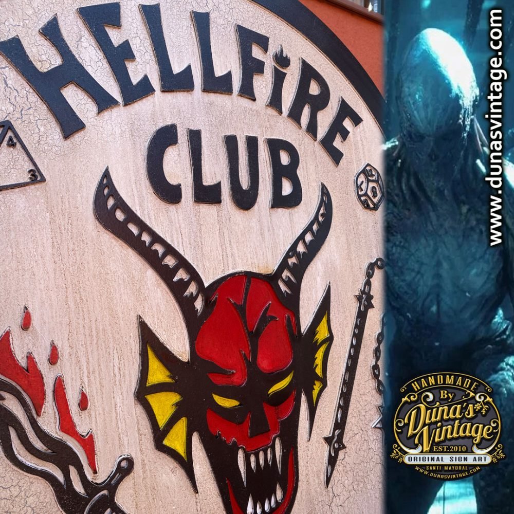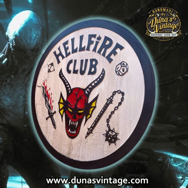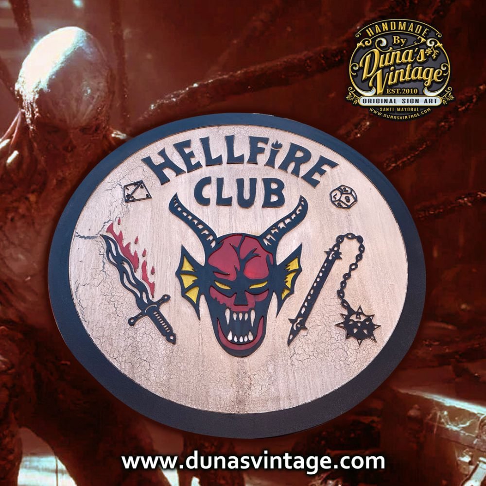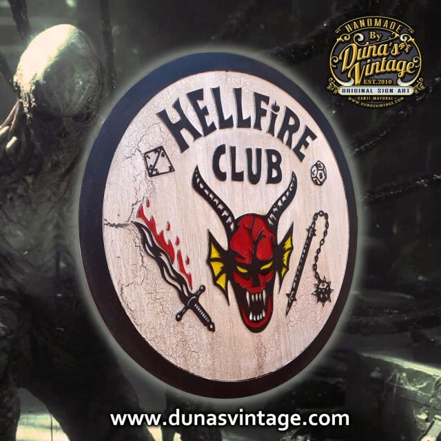 Aquí os dejo otro cartel del HELLFIRE CLUB, esta vez sin STRANGER THINGS fabricado en madera DM con relieve y pintado a mano con efecto envejecido, ideal para colgar en tu cuarto o estancia de tu casa. Tamaño 79cm de diámetro disponible en la tienda de Duna´s Vintage. (Este encargo se ha ido para Madrid)