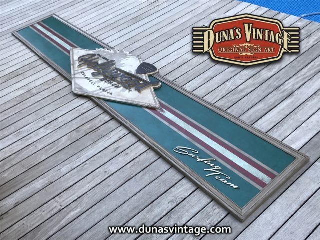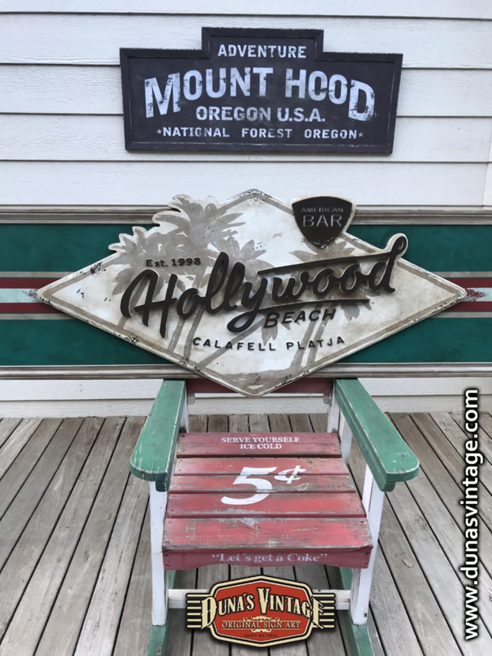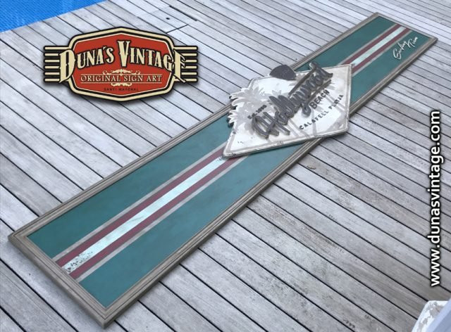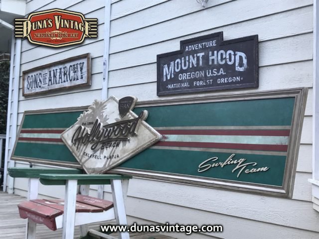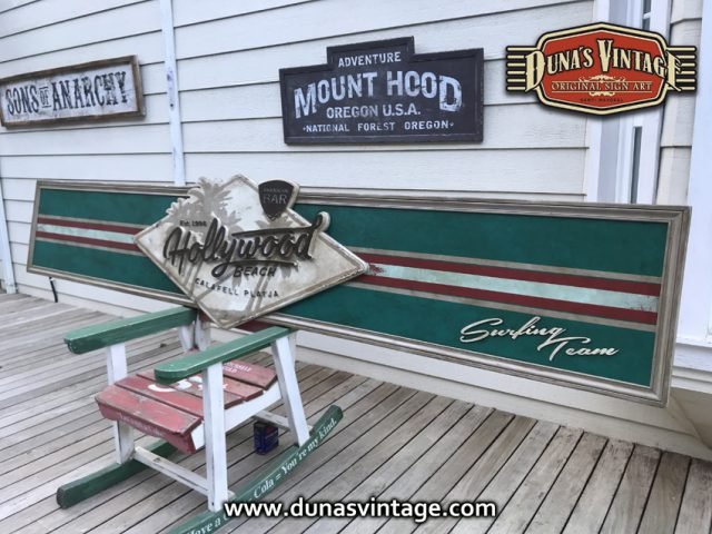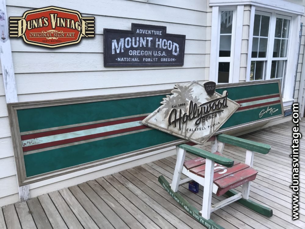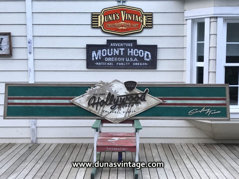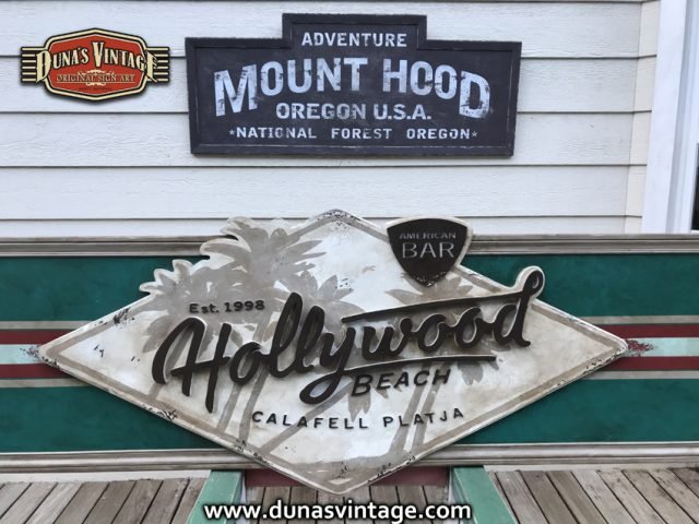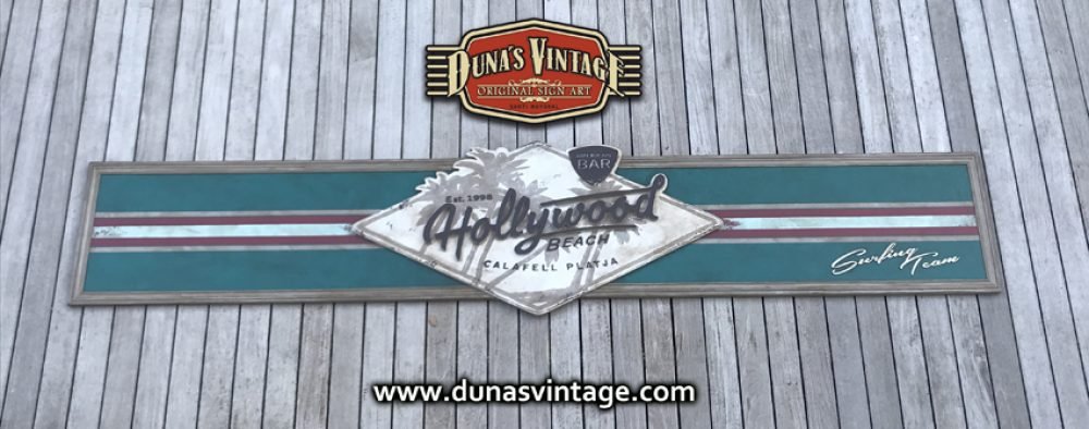 Cartel de Madera contrachapado de 20mm Hollywood Beach Calafell, tamaño 3250x650mm este cartel se a trabajado en difentes relieves el logotipo y letras en madera de 18mm de grosor y acabado Duna´s Vintage.