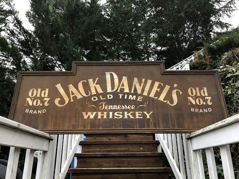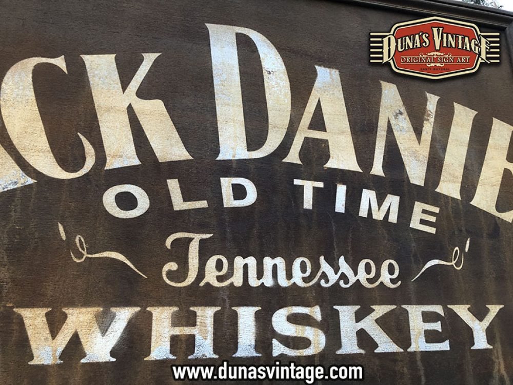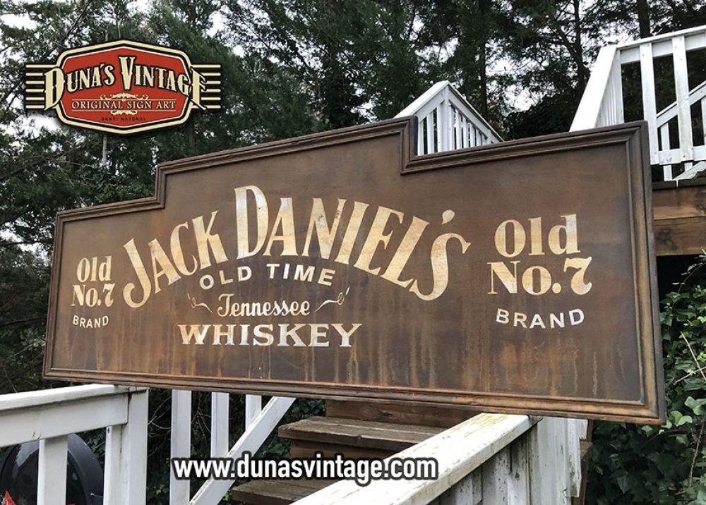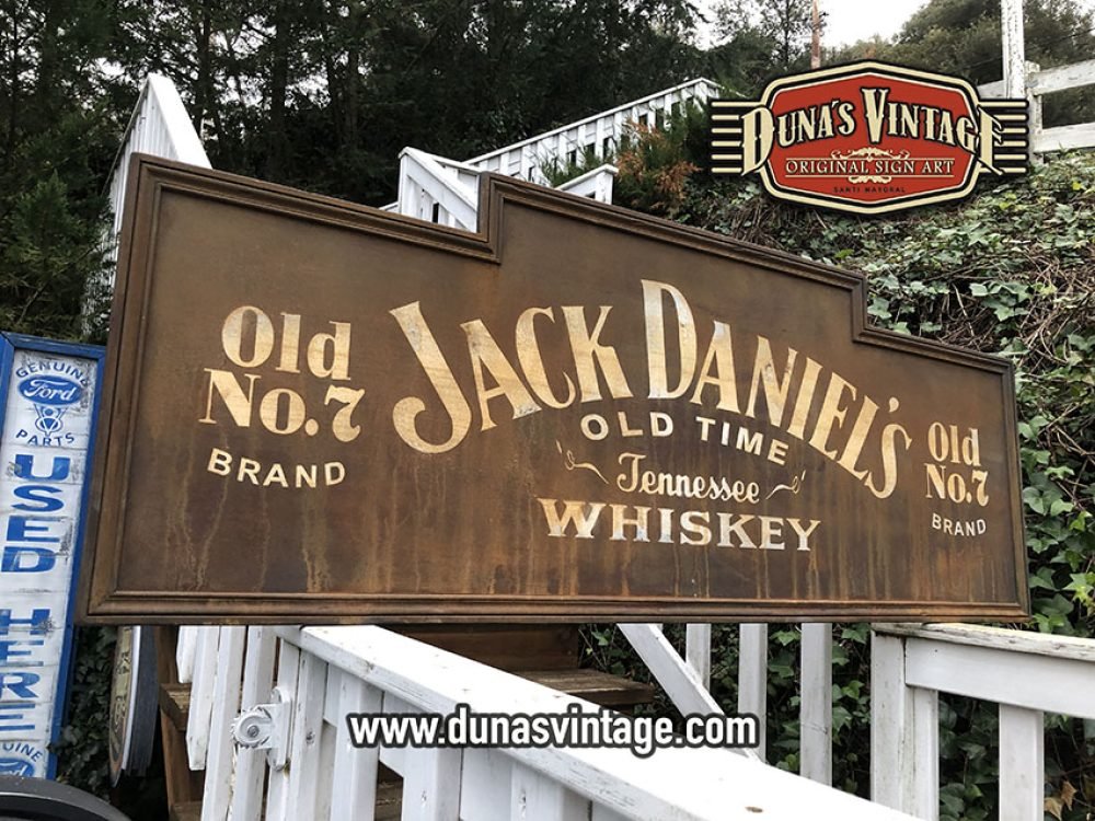 Cartel de Madera contrachapado de 15mm de la marca de Whiskey Jack Daniel´s tamaño 1750x650mm en ente cartel se a trabajado la técnica de oxidación sobre madera y el efecto es realmente muy autentico.