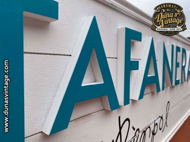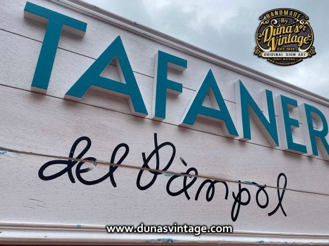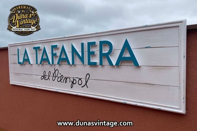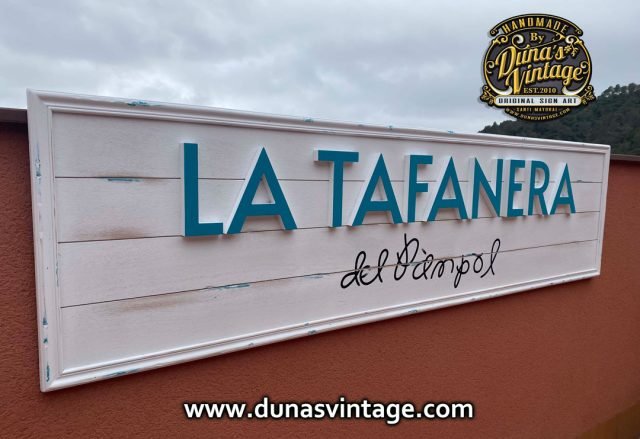 Aquí os dejo un nuevo cartel esta vez para una nueva Vermuteria en Rubí BCN, LA TAFANERA del Pàmpol cartel de Madera con letras en relieve con acabo envejecido pero muy sutil pero no perdiendo la esencia de los trabajos que hace Duna´s Vintage. Tamaño del cartel 1900x500mm.