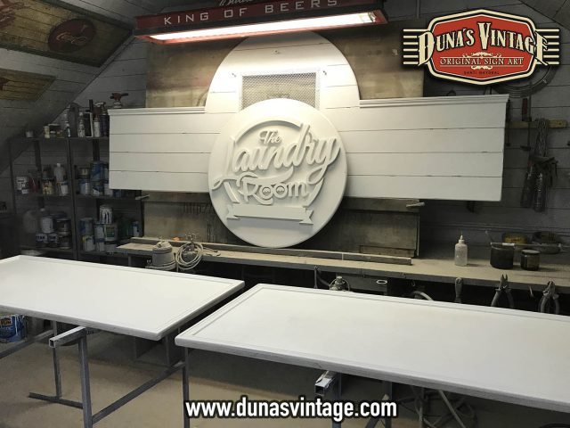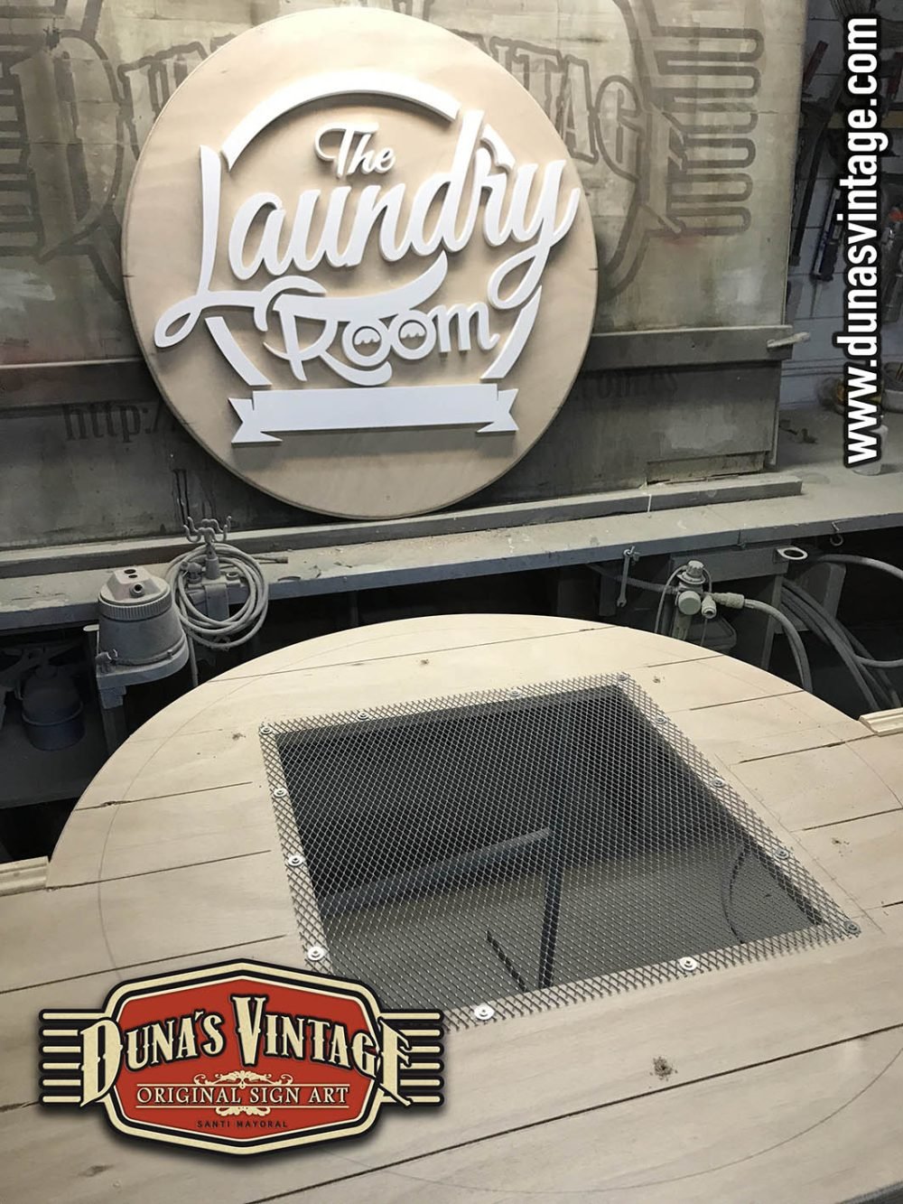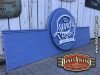 Cartel de madera contrachapado de 18mm tamaño 2400x950mm, este cartel se a trabajado el logo en relieve sobre una circunferencia separada por 50mm para que pueda respiras una salida de ventilación que hay en la fachada, mas dos pizarras de 1300x600mm que irán a ambos lados de la fachada.