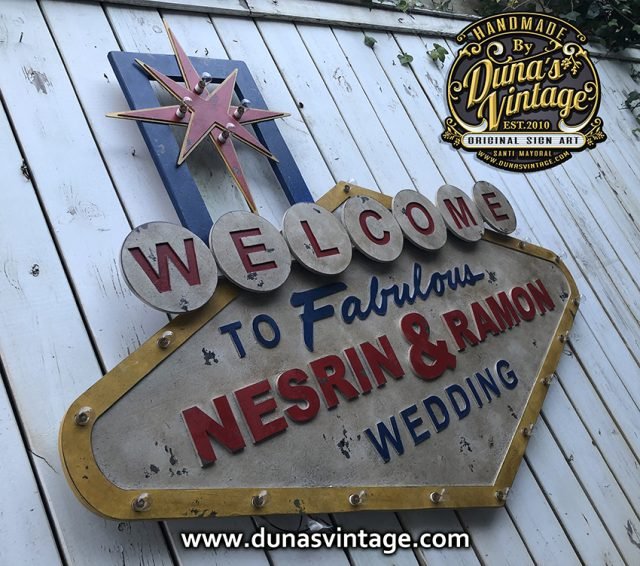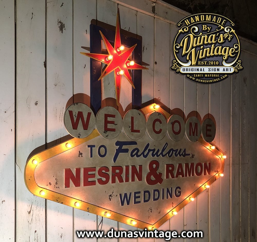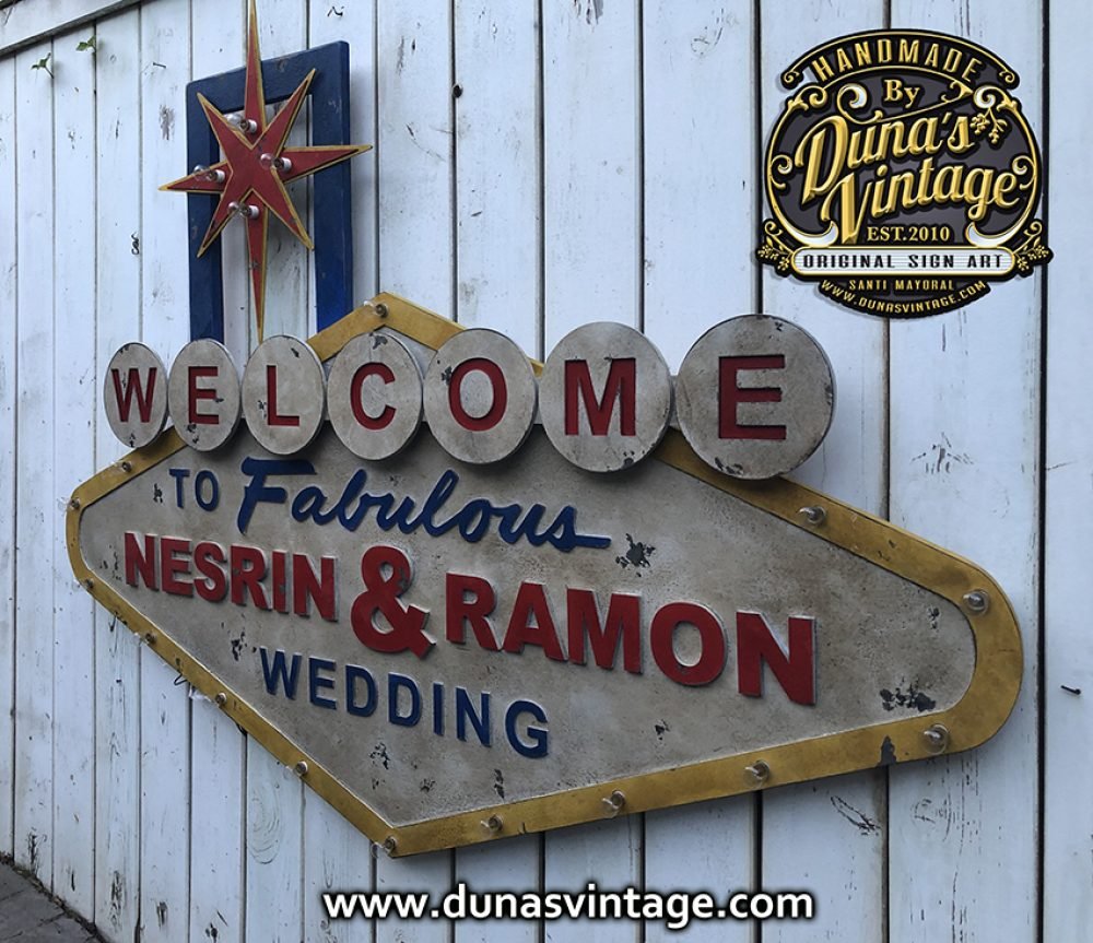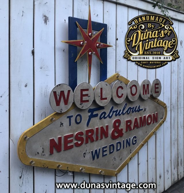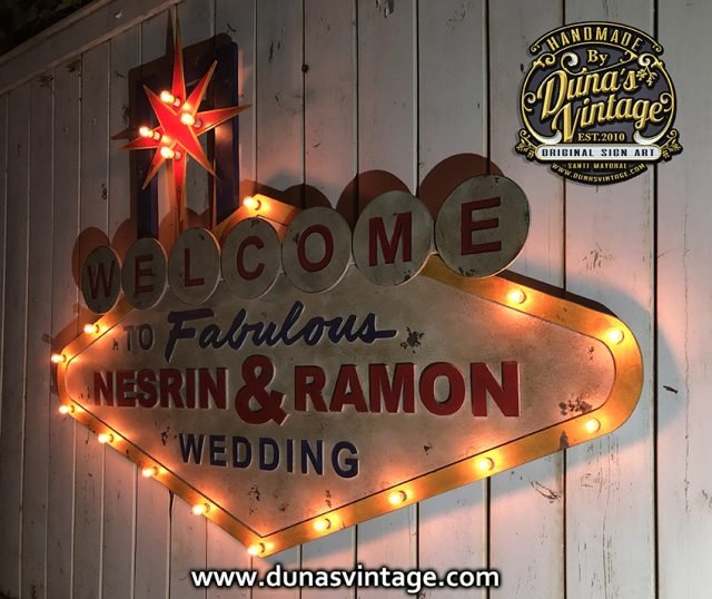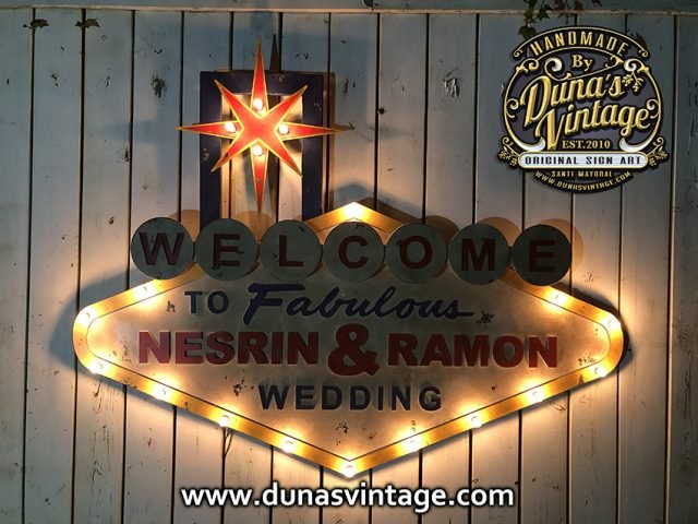 Cartel de Madera en relieve tipo Welcome Las Vegas pero personalizado para la boda de Nesrin & Ramon iluminado con bombillas para darle un toque mas autentico este cartel es de 1700x850mm. Felicidades pareja.