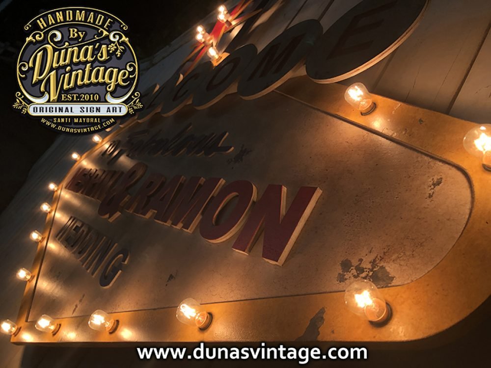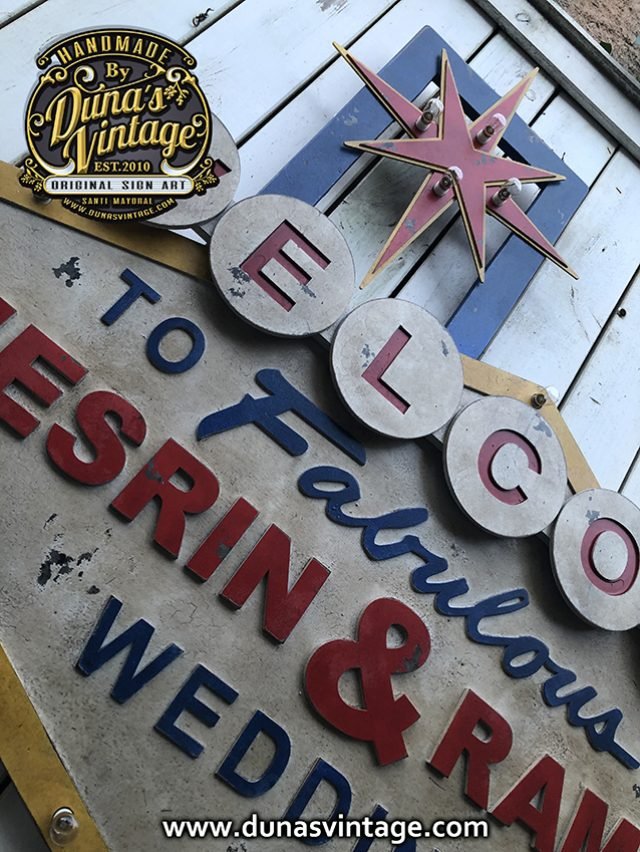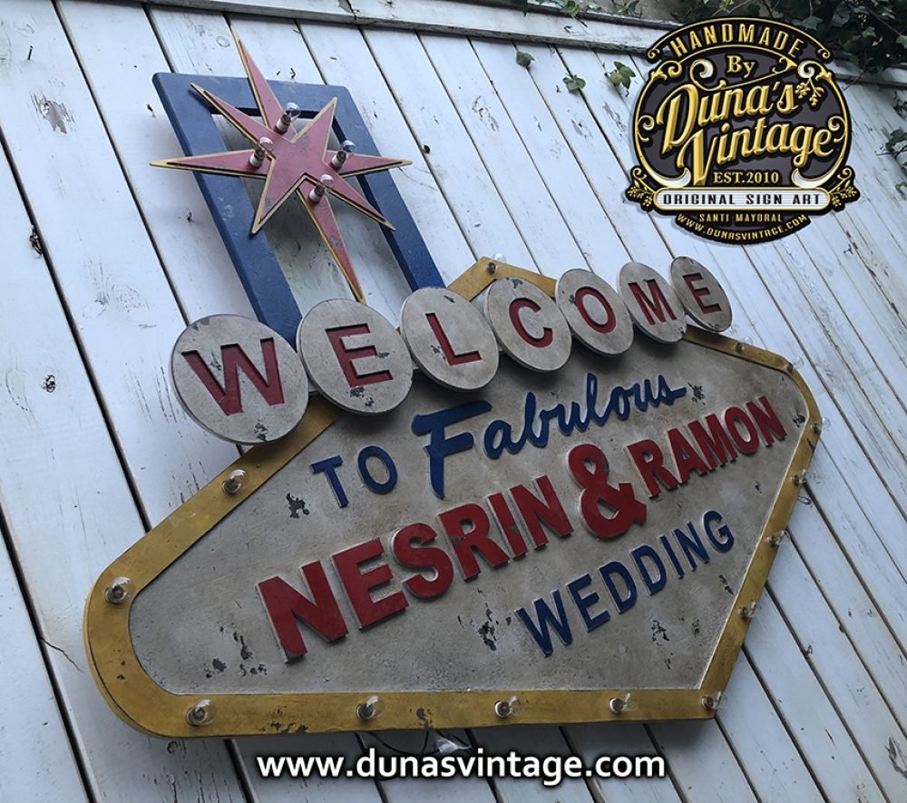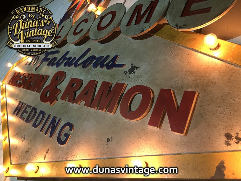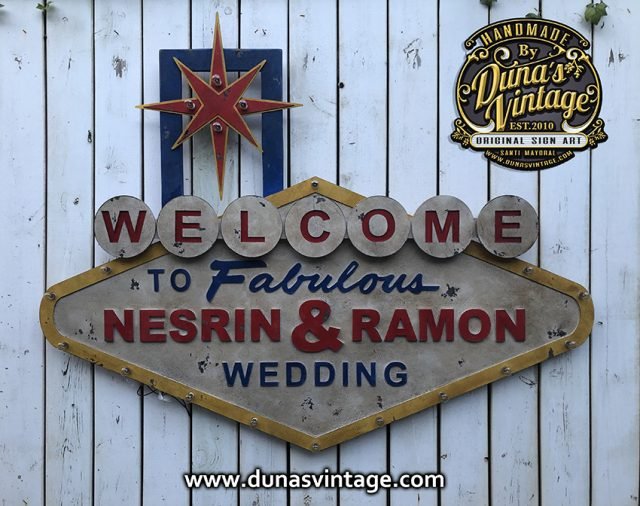 Cartel de Madera en relieve tipo Welcome Las Vegas pero personalizado para la boda de Nesrin & Ramon iluminado con bombillas para darle un toque mas autentico este cartel es de 1700x850mm. Felicidades pareja.
