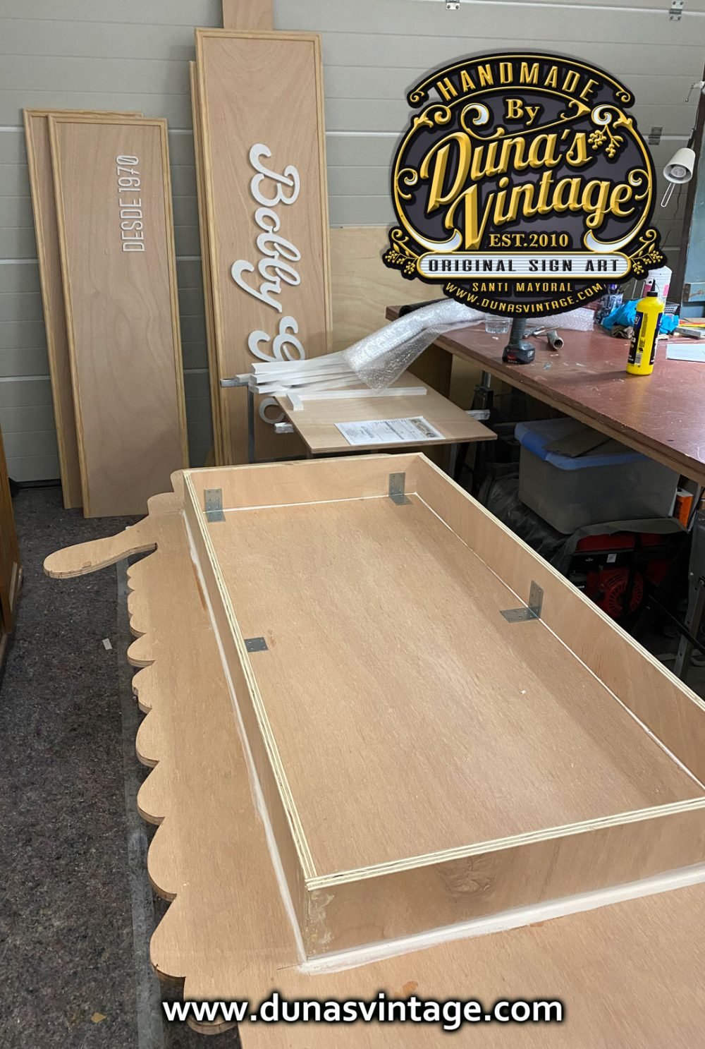 Aquí os dejo las fotos del cartel terminado para Luminosos Villoro una empresa de las pocas que hay en Barcelona especializadas en tubo de neón y que pueda decir que se fundó en 1970. Este cartel de 4600x950mm trabajado con tablero marino y en 3 piezas para poder trabajarlo mejor, ahora queda que el artista Leo le dé el toque con Neón que quedara espectacular.