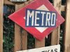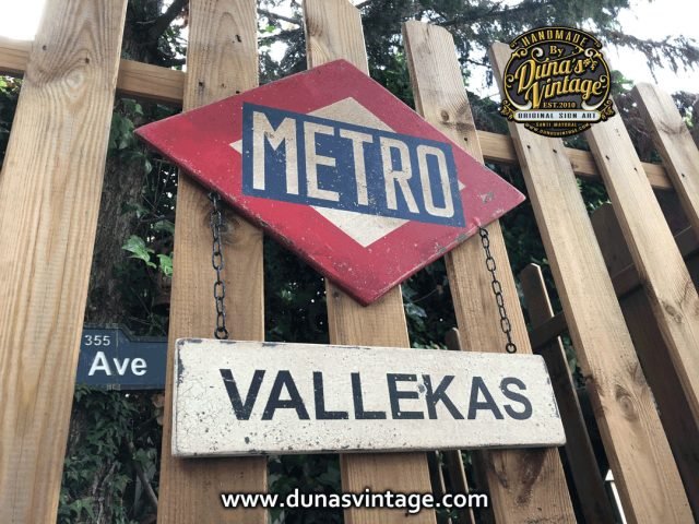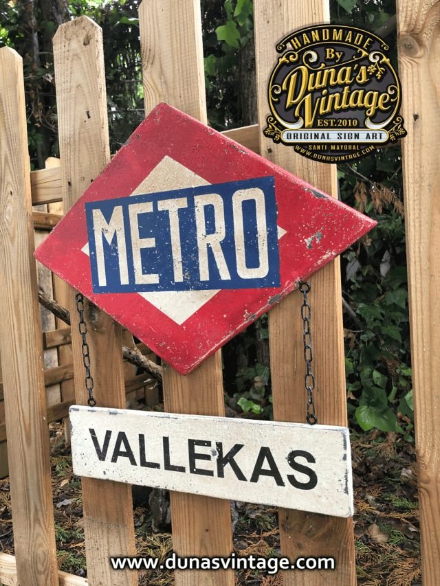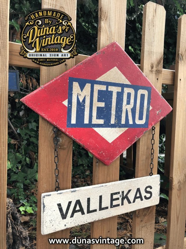 Cartel de Madera contrachapado tamaño 35x50cm placa Metro y 40x10cm trabajado con efecto Vintage y cadena metálica.