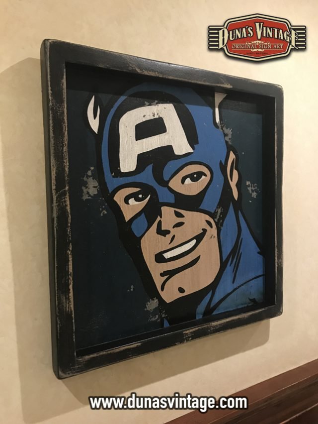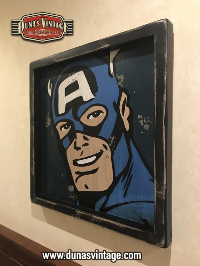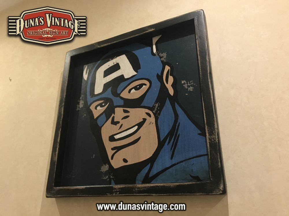 Cartel de Madera Superhéroes Vintage Captain America, tamaño 550x550mm pintando a mano y con efecto Vintage.