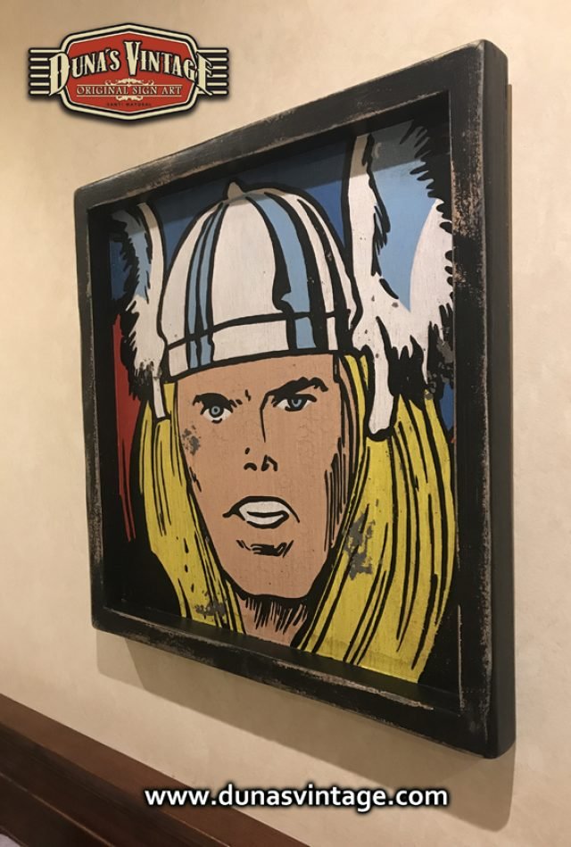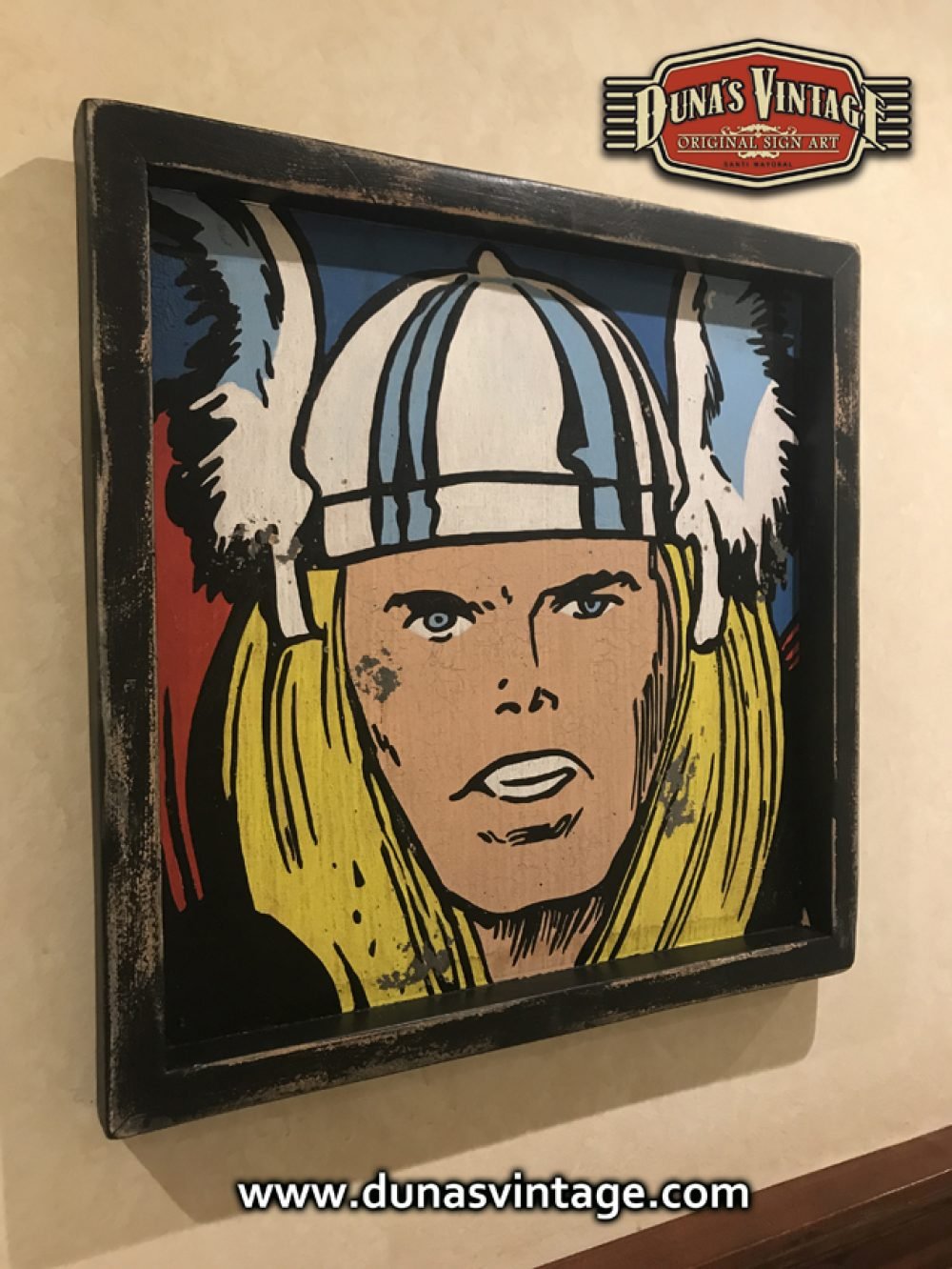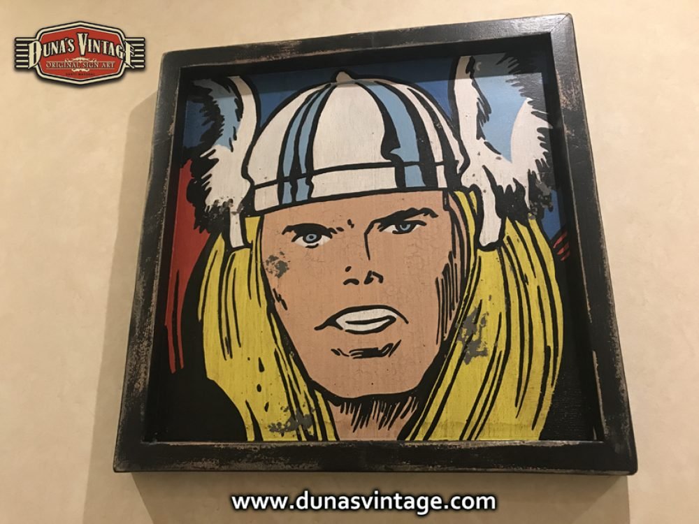 Cartel de Madera Superhéroes Vintage Thor, tamaño 550x550mm pintando a mano y con efecto Vintage.