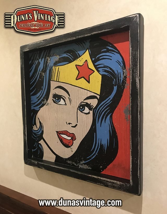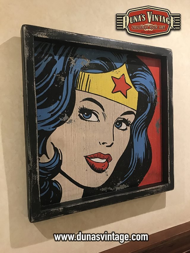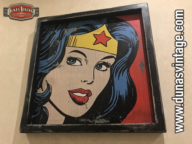 Cartel de Madera Superhéroes Vintage Wonder Woman, tamaño 550x550mm pintando a mano y con efecto Vintage.