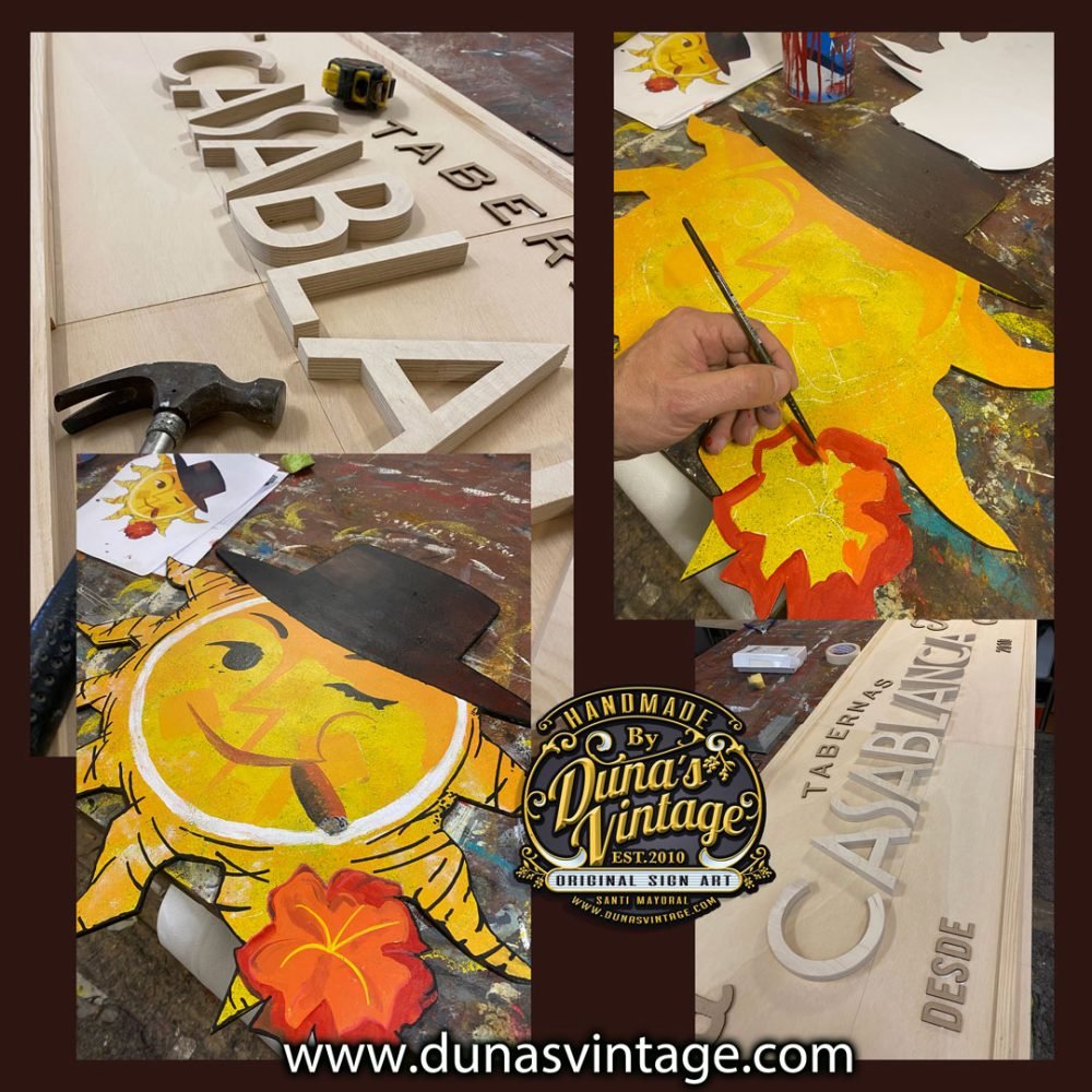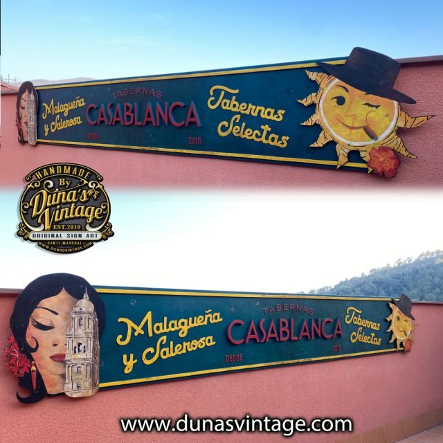 Aquí os dejo un nuevo cartel para Tabernas Casablanca de Málaga, cartel en diferentes relieves, tenemos las letras de Casablanca cortadas en madera de 18mm y el resto de tipografías en grueso de 4mm y dos ilustraciones pintadas a mano a cada extremo del cartel. El tamaño del cartel es de 300x60cm.