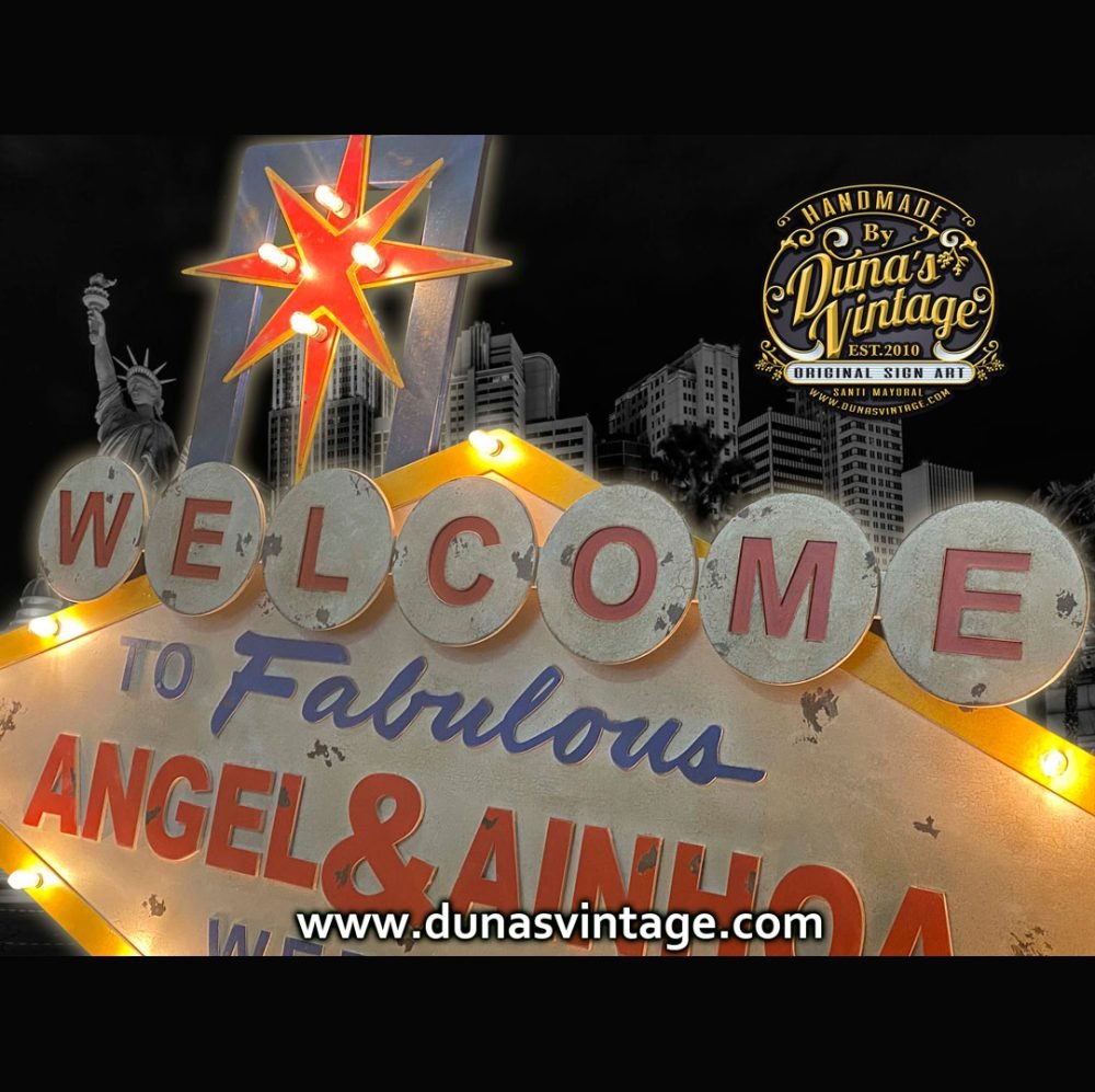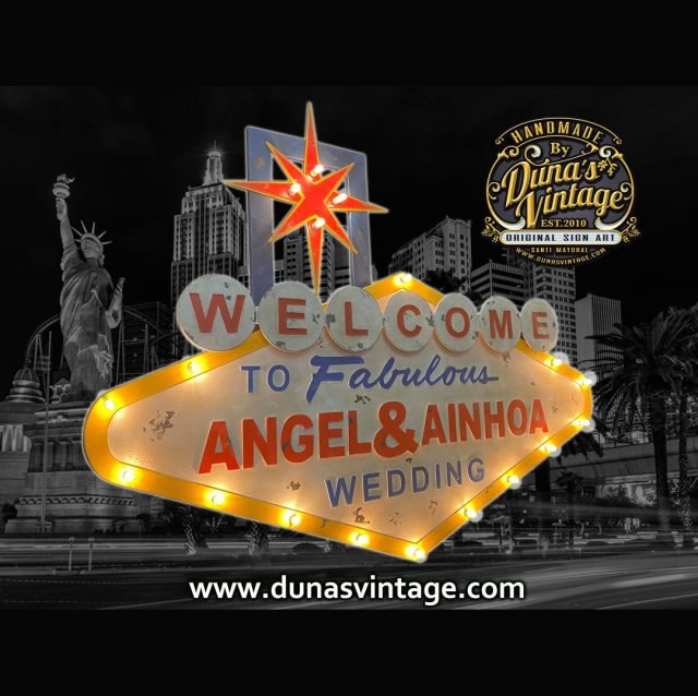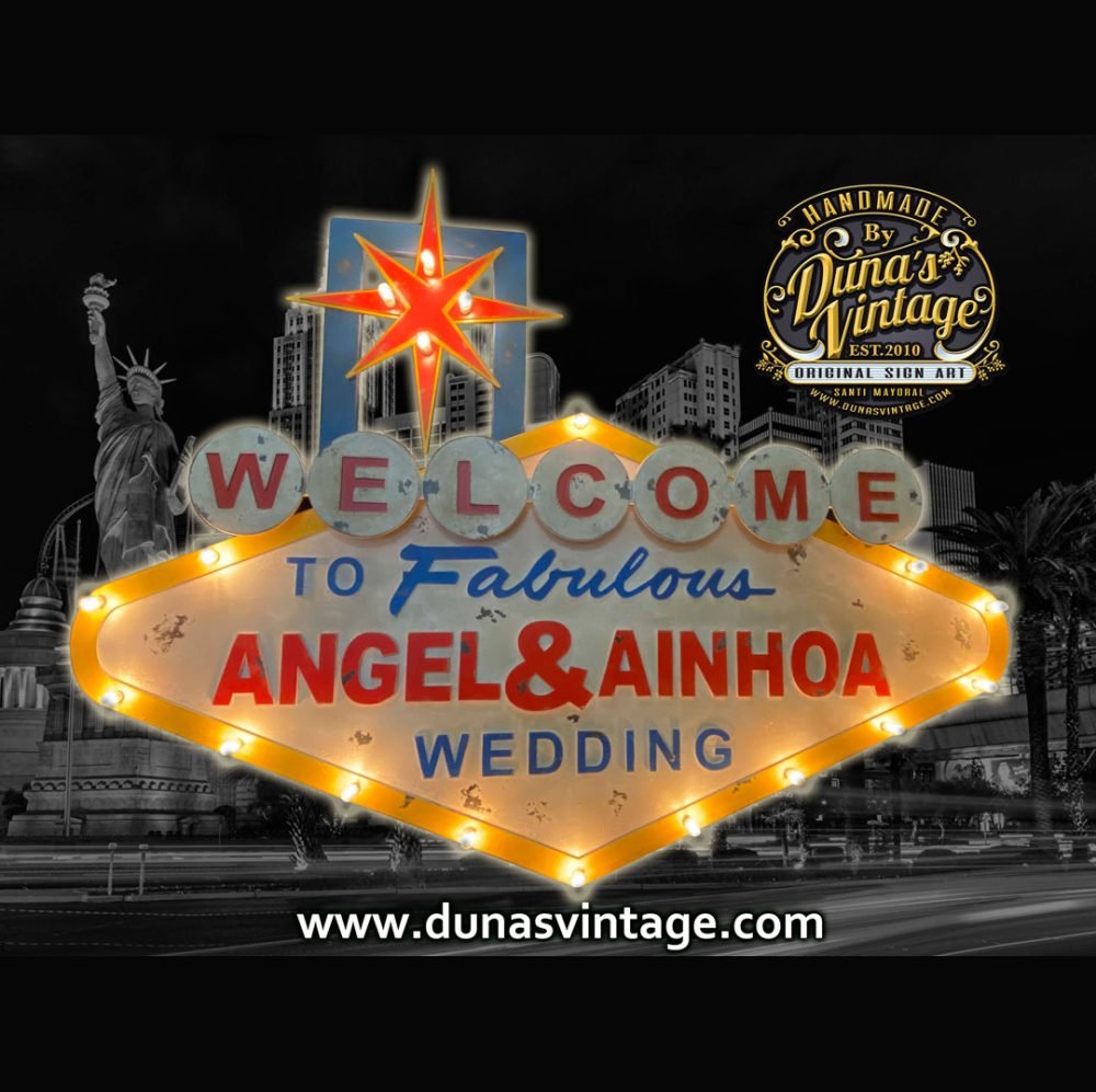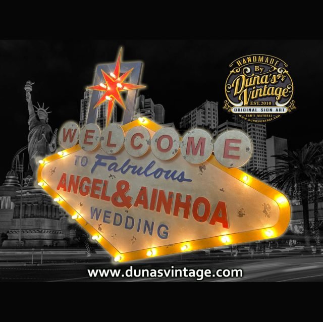 Cartel para la boda de Angel & Ainhoa en Sevilla, es el típico cartel de Las Vegas pero personalizado para bodas, el tamaño del cartel es de 1700x1300mm con iluminación un detalle para la boda y luego para colgar en cualquier pared de casa.